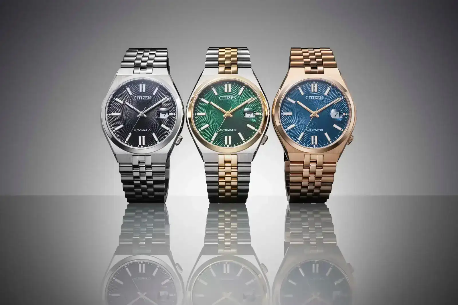 Los diales preciosos.Citizen sigue sacando variantes del súper ventas TSUYOSA, a destacar el cambio de movimiento al 8310 (los primeros montan el 8210), el brazalete jubilee y los diales guilloche, bien bonitos a mi parecer.