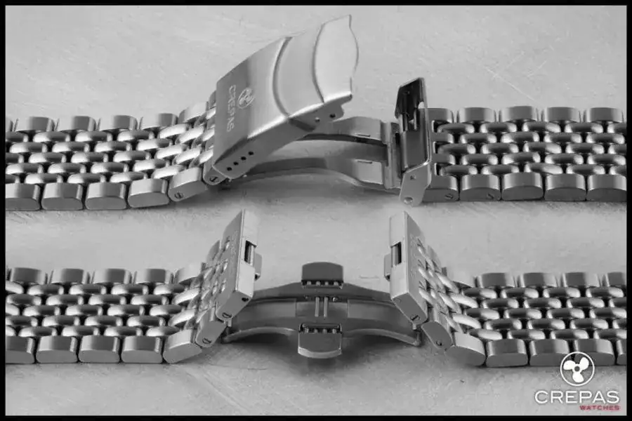 - Brazalete de acero tipo grano de arroz con un cierre oculto y con otro cierre extra desplegable con extensión para traje de buzo.