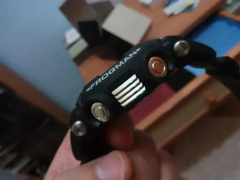 La trabilla de la correa es metálica, con la inscripción grabada de G-SHOCK, haber si Casio ya de una vez por todas, empieza a distinguir de sus G-SHOCK a los Frogman y graba en las correas, logotipos de FROGMAN o alguna rana, para darle imágenes únicas a éste modelo, ya que es uno de sus buques insignia de la marca, lo único hay que tratarlo como único, es una opinión personal.
