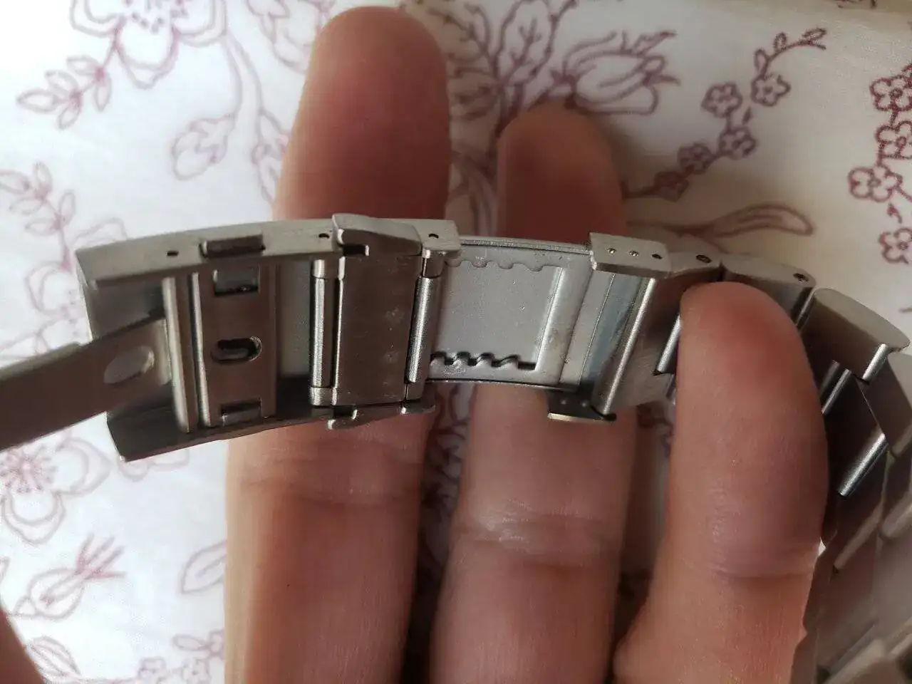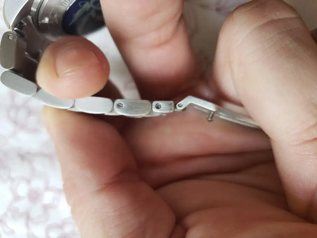 ADemás de ello un brazalete de acero solido, no es de placas que los eslabones estan entornillados, no con pasadores deslizables.