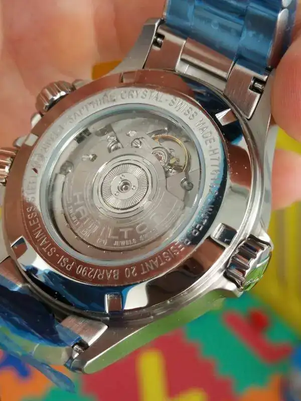 Cuenta con una trasera en zafiro, que nos permite apreciar la belleza del calibre ETA 2893-1 muy bien decorado por Hamilton.
