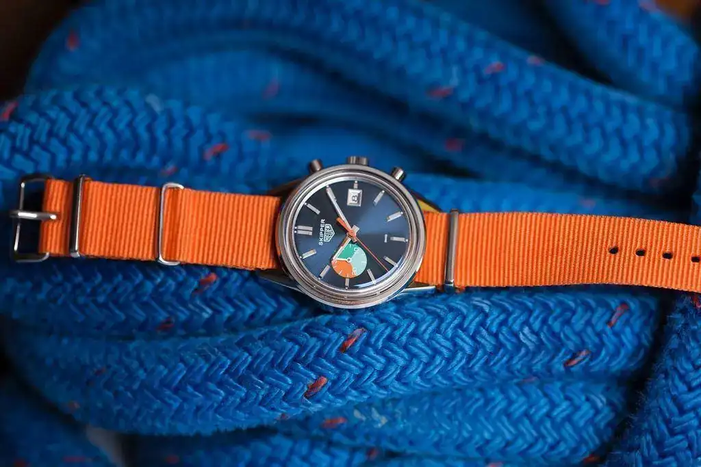 Heuer Carrera Calibre 18 "Telemeter". Toma la caja (39mm), correa (18mm) y algunos otros detalles.