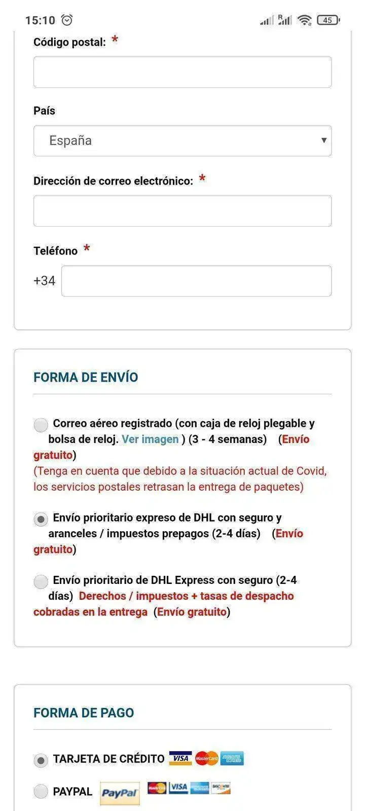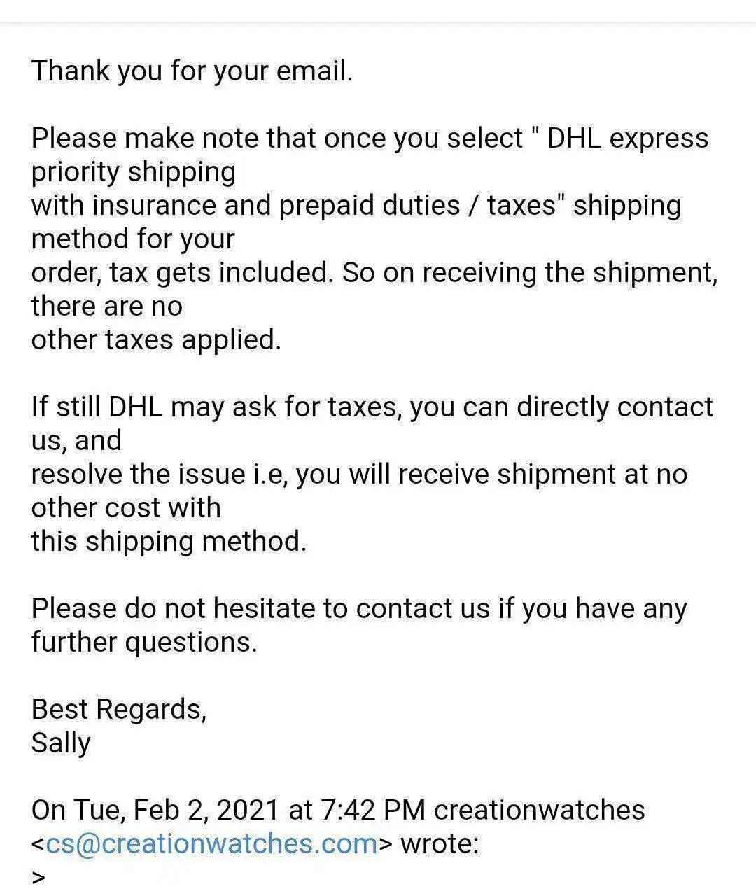 Buscando un reloj para regalar me planteé comprarlo en CreationWatches entre otras webs, conociendo los problemas habituales que tienen los compradores de esa página con Aduana presté especial atención al tema envío. Ofrecen 3 modos, 1) correo local (aduana a suerte y envío lento) 2) DHL con impuestos y aranceles PREPAGADOS y 3), DHL con impuestos a pagar al llegar (la que menos interesa ya que en un 99% es un sablazo). Sobre ese segundo metodo de envío, me pareció bastante interesante. Los recargos de impuestos me han parecido lo suficientemente razonables (+21€ en un reloj de 69€) para asegurarse que no haya problemas. Alguien sabe o entiende como yo que si prepaga esos costes no tendrá sorpresa luego, no? El total del reloj sigue siendo 50€ menos que en Amazon por ejemplo. La otras webs que estaba mirando son BUENABUY, CITYWATCHES, EGLOBALCENTRAL, ULTRAONLINE.ES.... Alguien tiene experiencia de primera mano con esas últimas webs?