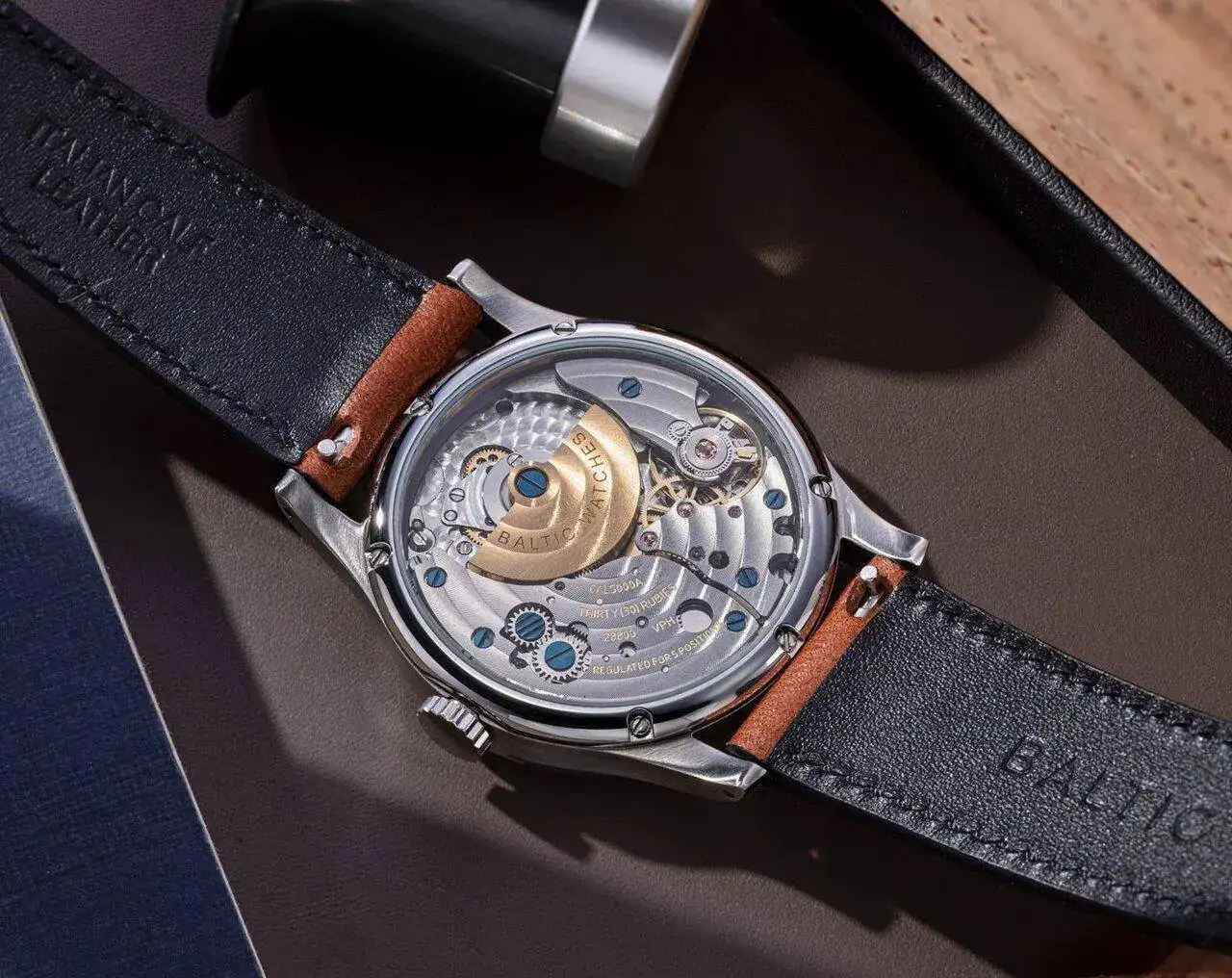 Mientras que la caja es más "normalita", muy en la línea de Baltic: con un buen diseño, y ejecución aceptable (bisel escalonado pulido en alto brillo, contrastando con la carrura en acabado cepillado horizontal...). El resultado estético del conjunto es muy satisfactorio, y por su diseño no parece tan pequeño pese a sus dimensiones. Las correas tienen buena calidad, en piel de becerro, fabricadas en Italia, y con una reducción de 20mm desde las asas a 16mm en la hebilla que acentúan o completan el aspecto clásico del reloj. Asas perforadas para facilitar el cambio de correas (aunque las de Baltic disponen de pasadores con cambio rápido).
