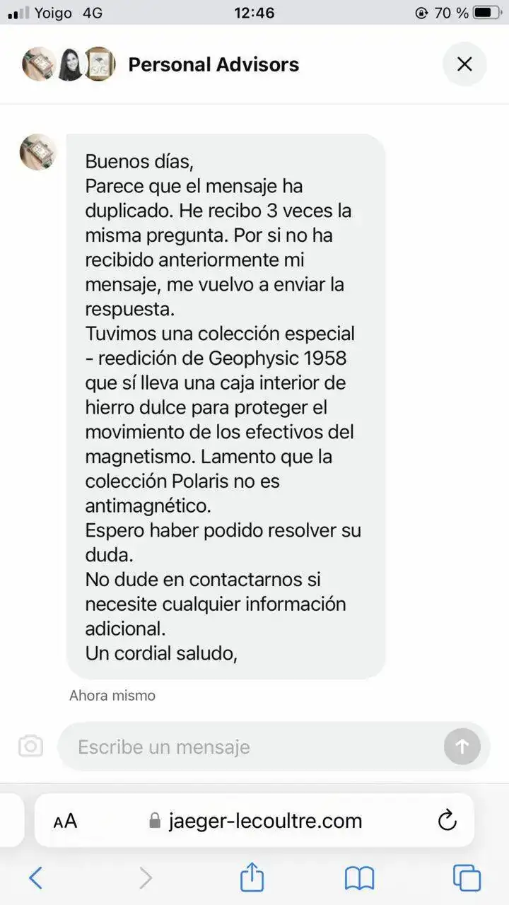 Vi que aunque era diver también solo tenía 100m pero en realidad es suficiente para la mayoría de casos así que pensé…. Fantástico pero y el magnetismo, no especificaba nada de él en un reloj supuestamente de la colección diver de la marca así que pregunté y esta fue su respuesta en chat directo
