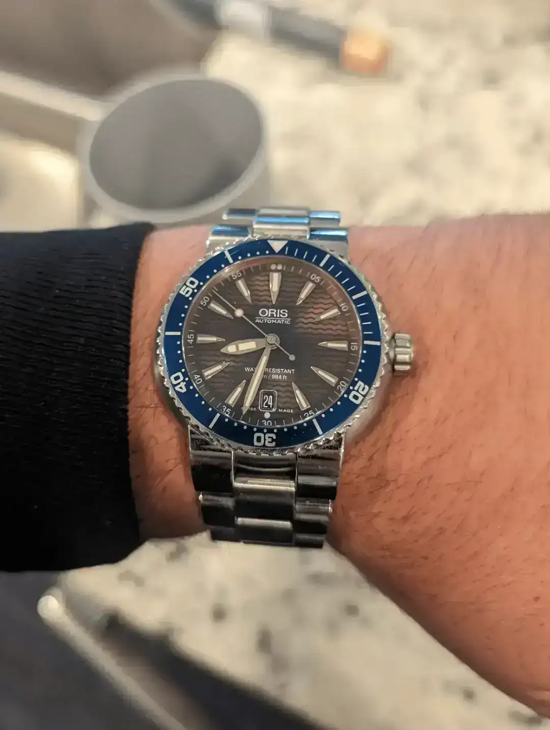 En su interior, nada sorprendente, calibre Oris 771 ( es decir ,sellita sw500/ eta 7750) con 62 horas de reserva de marcha y su tamaño es de 40mm.