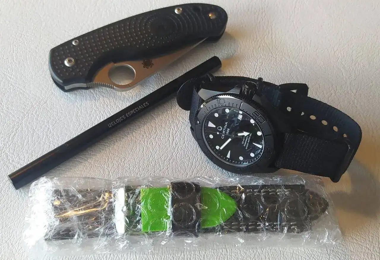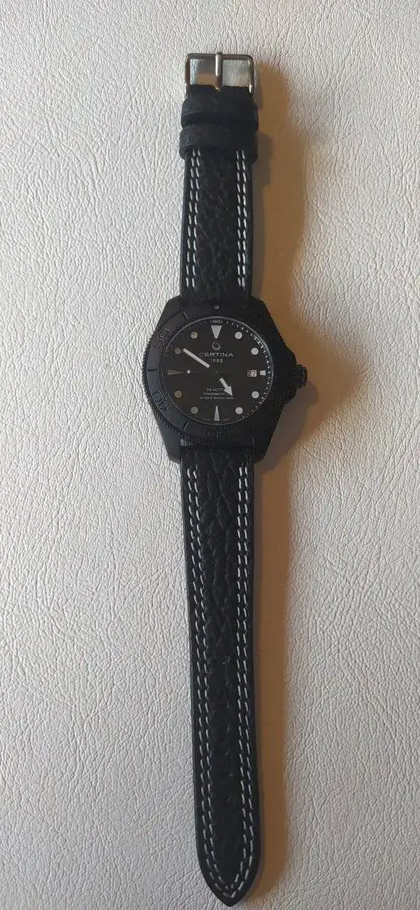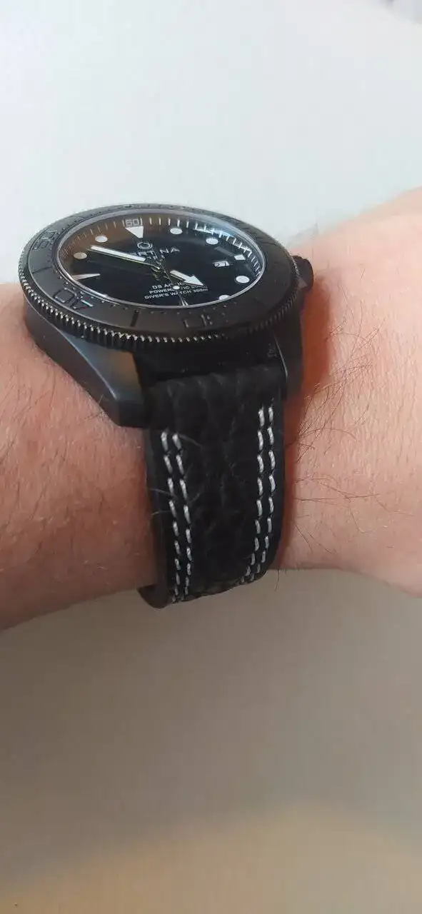 Es una correa de piel de tiburón en color negro con pespuntes blancos, especialmente escogida para mi Certina DS Action All Black. El cual además tiene una medida de asas un poco puñetera, 21 mm, por lo que la correa es 100% a medida.