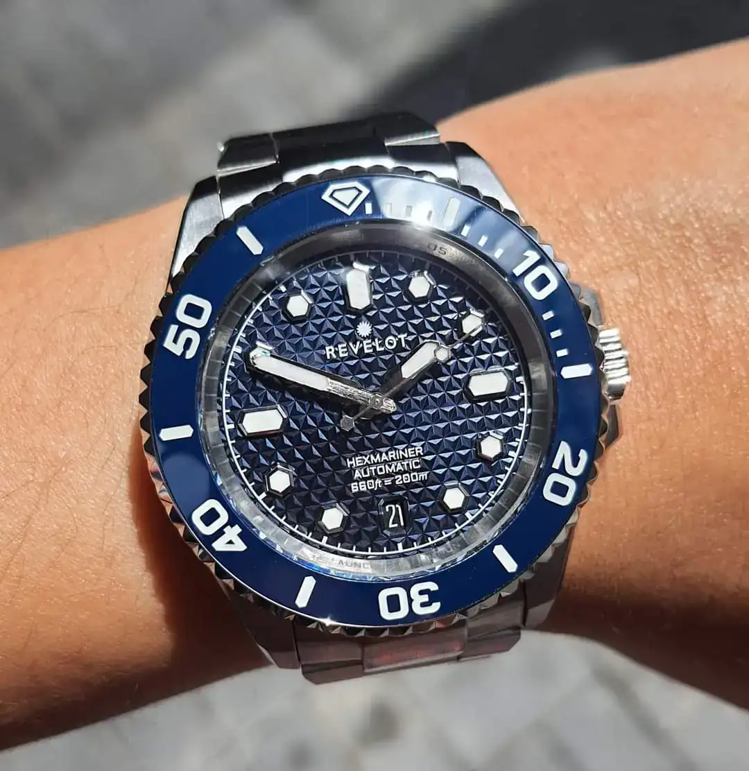 Podrían haber buscado otra muñeca para la foto promocional, a este modelo los 42mm (al menos 45 con guarda corona y corona) x 48mm le queda pelín grande. Del reloj poco que decir, un diver más en el mercado, a buen precio, eso sí. Por su diseño anguloso y contundencia me recuerda vagamente algún Zelos.