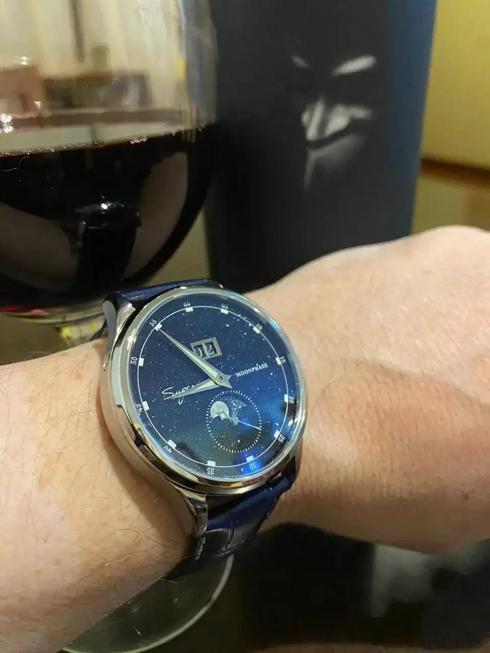 Yo recibo hoy este Sugess moonphase. Por el precio, increíble. Automatico, con un dial que es hipnótico al sol. De fondo un buen vino Argentino para los que gustan eventualmente de algo distinto. Alma Negra, de Ernesto Catena.