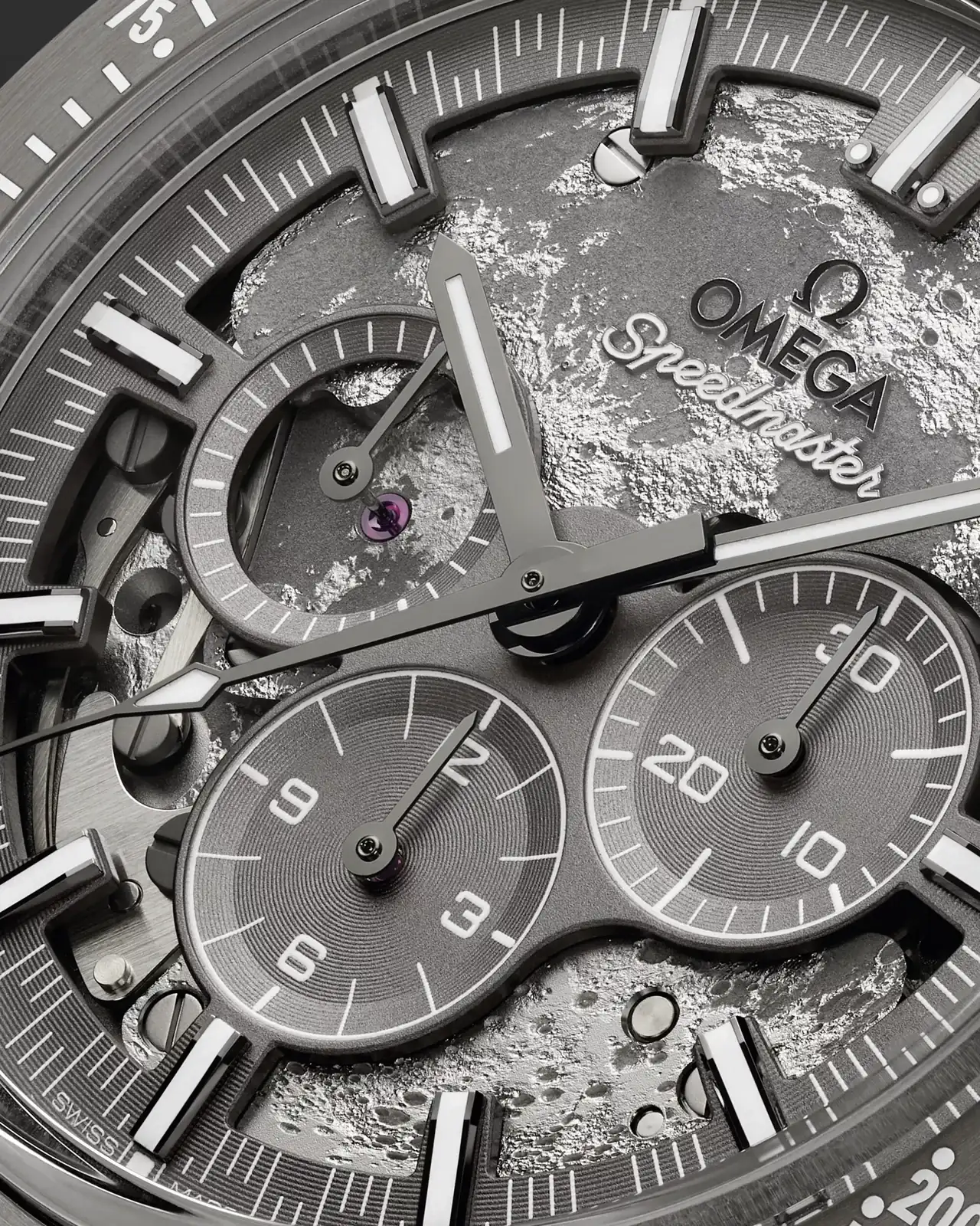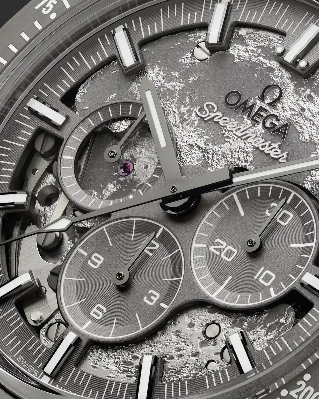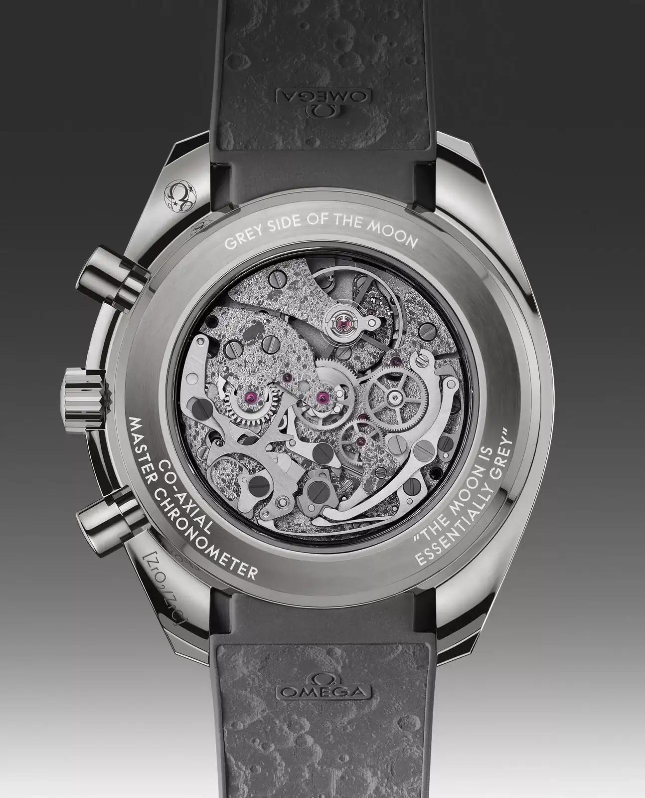(...) y un modelo que recuerda a la tripulación del Apolo 8, que fueron los primeros humanos en ver la cara oculta de la Luna, celebrando la histórica observación del astronauta Jim Lovell durante el Apolo 8: «La Luna es esencialmente gris». El reloj presenta una superficie lunar erosionada con láser, visible a través del movimiento. La cara visible de la Luna aparece entre la esfera gris esqueletizada, mientras que la cara oculta emerge a través del fondo de caja, creando un paisaje lunar envolvente. Está equipado con el Calibre 3869 Co-Axial Master Chronometer.
