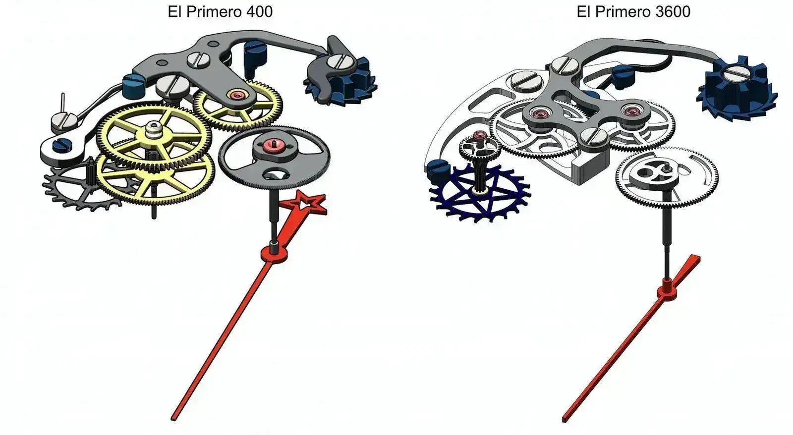 “”En el diagrama anterior, el mecanismo de conducción del cronógrafo para el El Primero 400 está a la izquierda, y el del 3600 a la derecha. El 400 es una configuración tradicional: la 4a rueda del movimiento (el engranaje amarillo inferior) impulsa la rueda motriz y la rueda de acoplamiento (las dos marchas amarillas superiores). Cuando el cronógrafo está activado, la rueda de acoplamiento cae en contacto con la rueda central del cronógrafo y el cronógrafo comienza a funcionar, con la aguja del cronógrafo central girando alrededor del dial una vez por minuto. En el calibre 400, la mano avanza cada décima de segundo. Si te gustan los cronógrafos, reconocerás esto como un mecanismo clásico de cronógrafo de embrague lateral controlado por ruedas de columnas.””