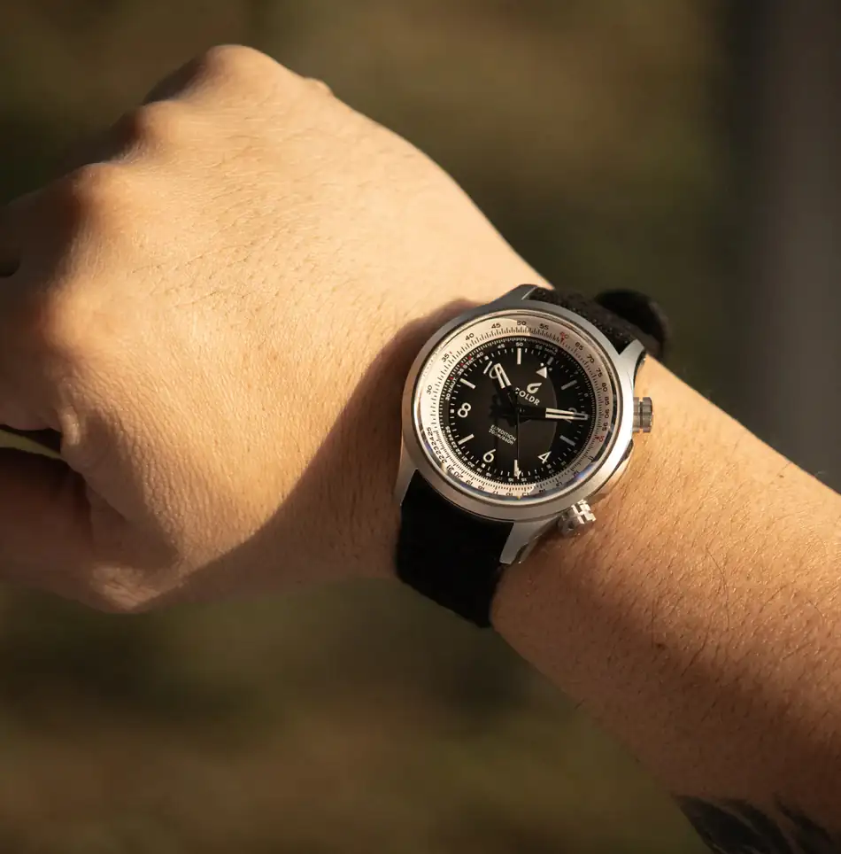 Tiene buena pinta, al menos a mi me gusta bastante caja de 41 mm con un lug to lug de 47,5mm, en su esfera lleva un bisel interno con regla de cálculo accionado por una segunda corona, ambas coronas roscadas y WR de 200 metros, todo alimentando con un más que decente miyota 9039. Disponible en tres colores Azul, verde y negro.