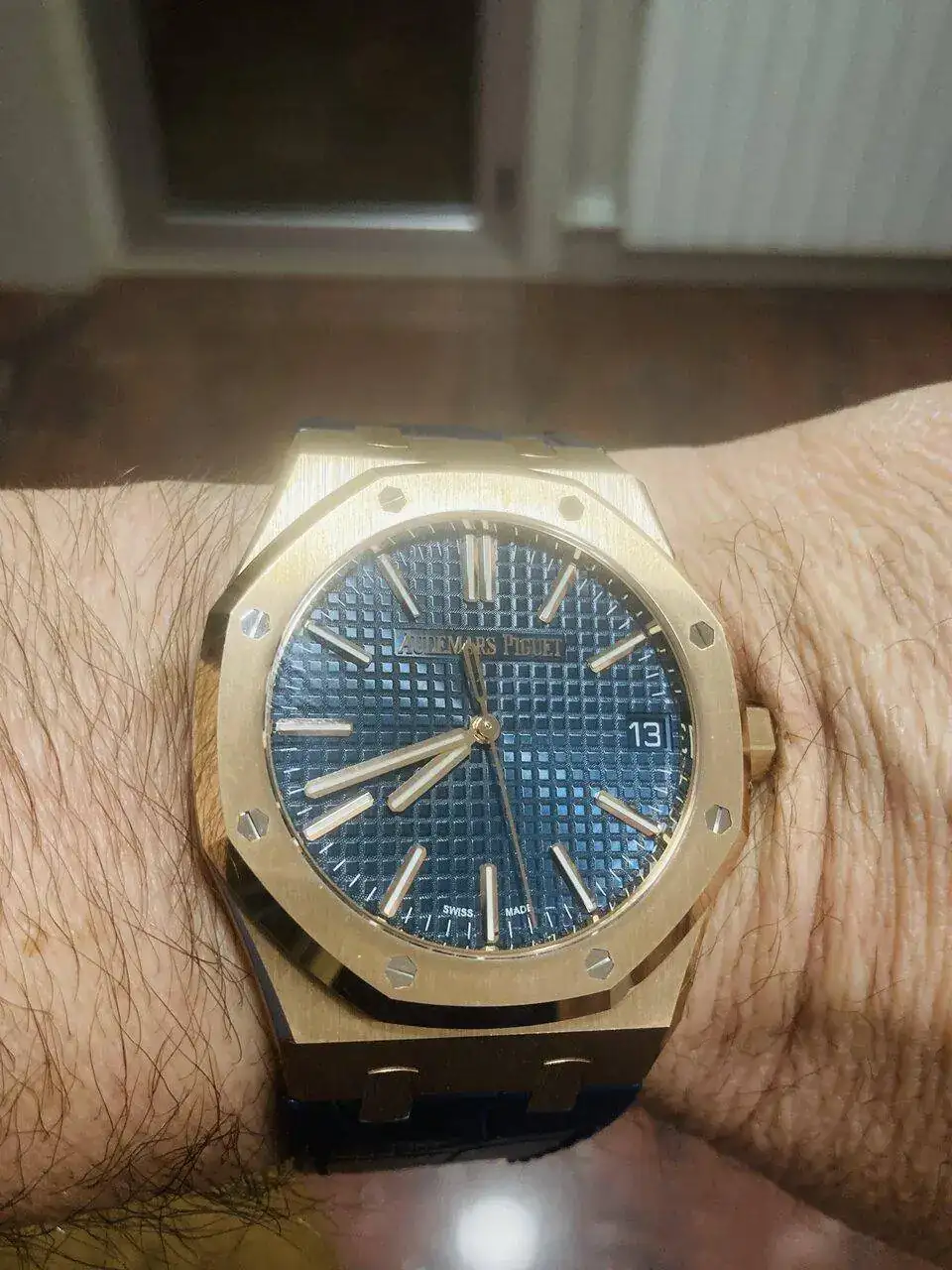 Creo que no conocia esta configuración. Piel oro rosa, esfera azul, 15500?Royal ok ,estreno esta tarde