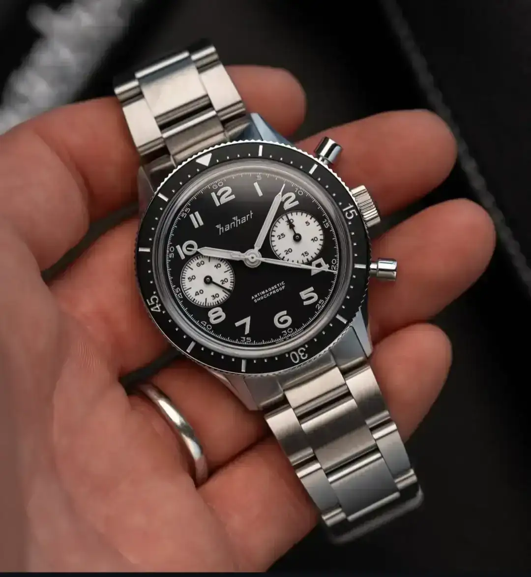 En 41 o 42 mm perfectísimo (para los que calzamos muñeca).Hanhart saca un nuevo modelo 415 con bisel diferente del 417. En 39mm y sigue siendo de cuerda. A mi me resultan muy atractivos