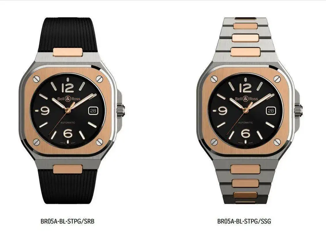 Después de los modelos en acero y de un modelo completamente en oro rosa (caja y brazalete) llega el BR05A-BL-STPG, una combinación de caja en acero con bisel de oro rosa y detalles de ese metal en la correa de caucho y en el brazalete de acero.