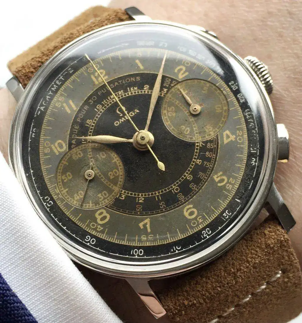 En este esfera del OMEGA calibre 33.3 se puede leer las escalas, en el nuevo no ves nada. La esfera del nuevo esta muy mal hecha, si hacen un chronografo de este estilo es para tener un beneficio, el nuevo no tiene.Mas que un cruce entre esos tres, yo veo un rescate de una esfera clásica de Omega, “deportivizándolo” en la caja de un Speedmaster.