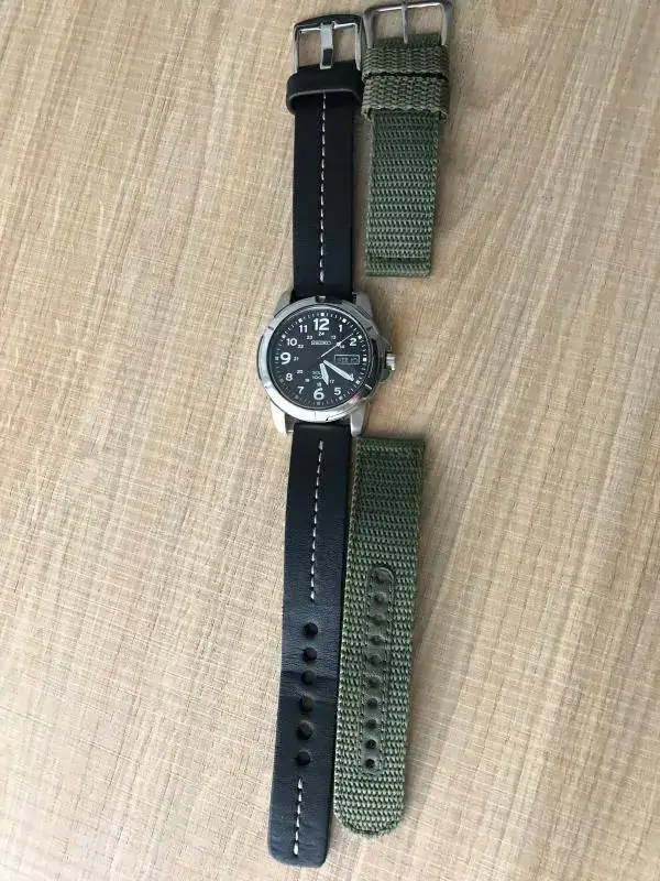 En esta foto se ve la correa comprada y el reloj de destino un Seiko solar que no me gustaba con la nato original de muy mala calidad y no me lo puesto casi nunca. No se si sera el destino definitivo ya que tengo dudas porque le viene un poco holgada. Al lado está la nato original. En mi opinión gana mucho con la nueva. Ya direis