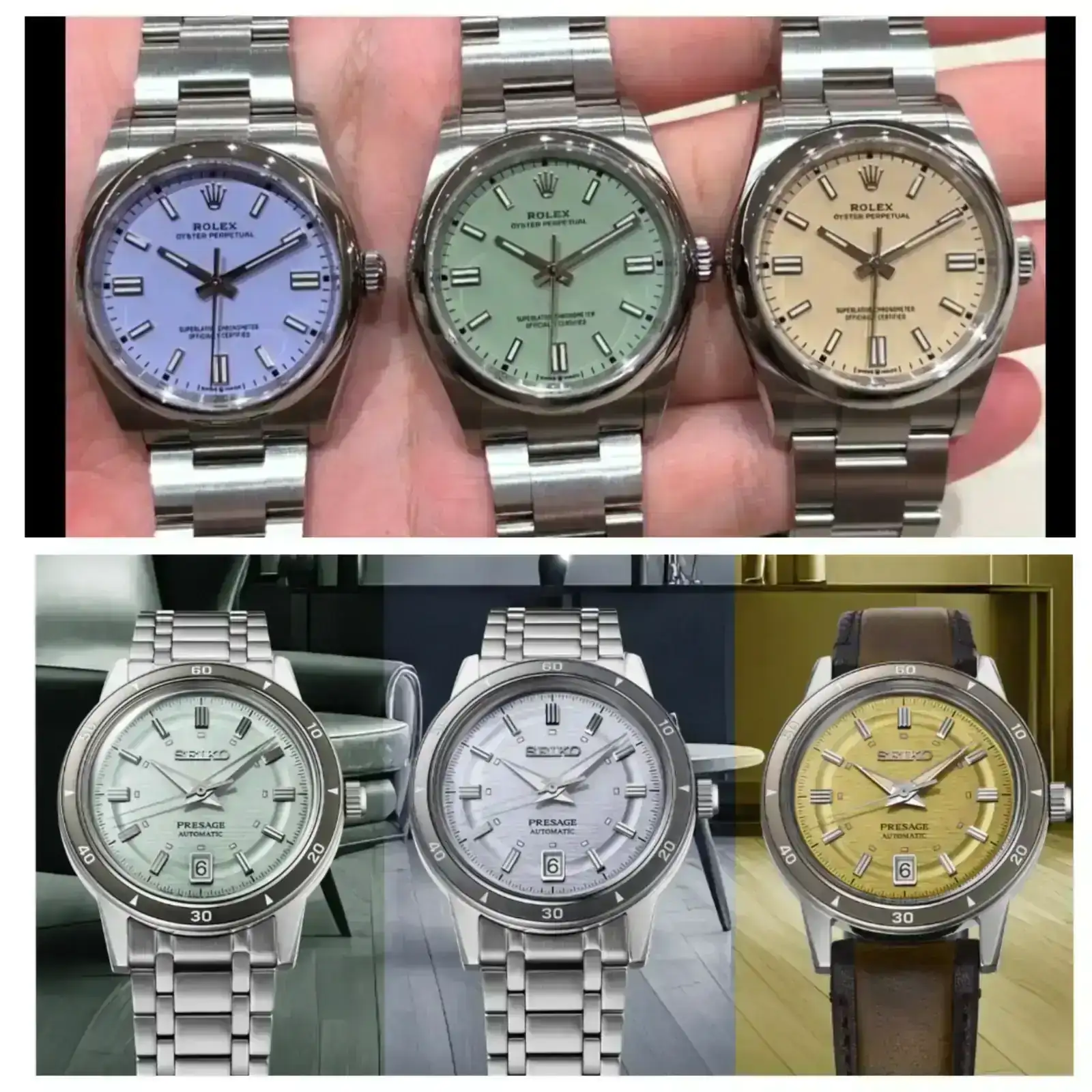 Personalmente no los veo tan similares, la verdad. El beige en el Seiko es más tirando a dorado envejecido que otra cosa, y el pistacho lo veo más turquesa en el Seiko. Quizás el lavanda sería más parecido al OP, pero en un tono mucho más claro en el Seiko.Me vinieron a la cabeza los colores, nada más... beige, pistacho y lavanda...
