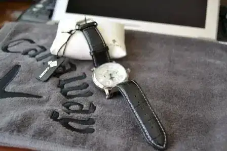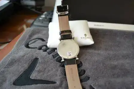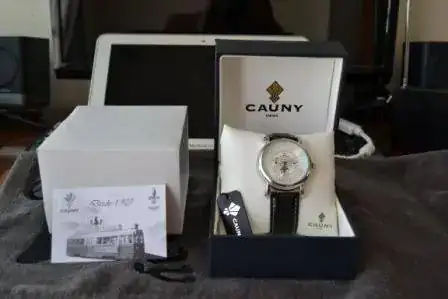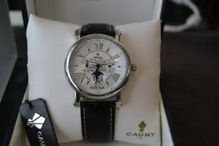 Saco a la venta este precioso reloj CAUNY, sin estrenar, como prueba los plásticos sin retirar del cristal mineral y del fondo del reloj, así como el estado de la correa.