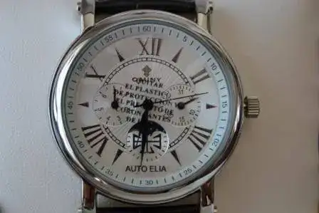 Se trata de un reloj clásico de potnente presencia, 42 mm de caja sin contar corona, índices en romanos en plateado, agujas en negro, día de la semana, día del mes y fase lunar.