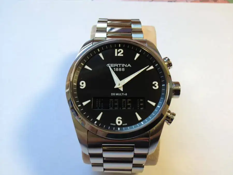 Digital: GMT 1 y GMT2, alarma (T1 et T2) sonora y vibrante o solo vibrante si prefieres ser discreto, temporizador, día, fecha, semana, mes, año, cronógrafo (tiempos intermediarios, adicionales y secuenciales) con memoria y retroiluminación