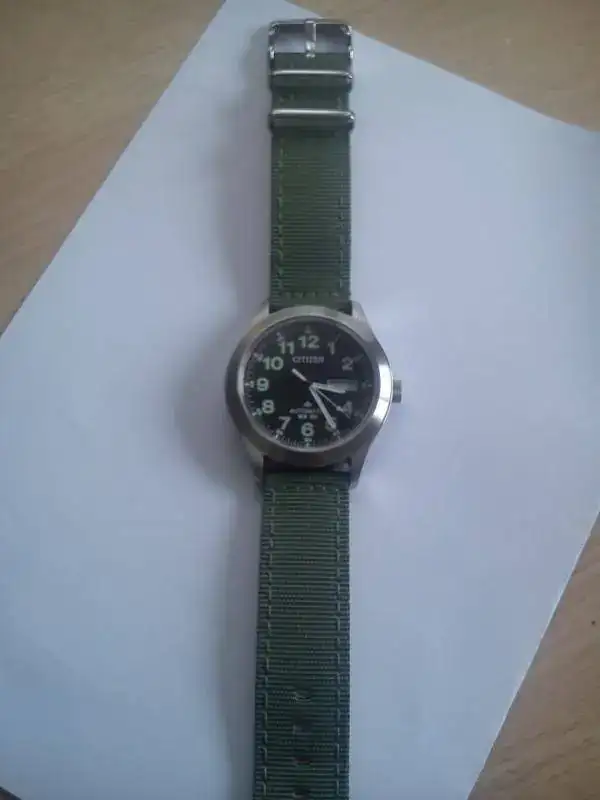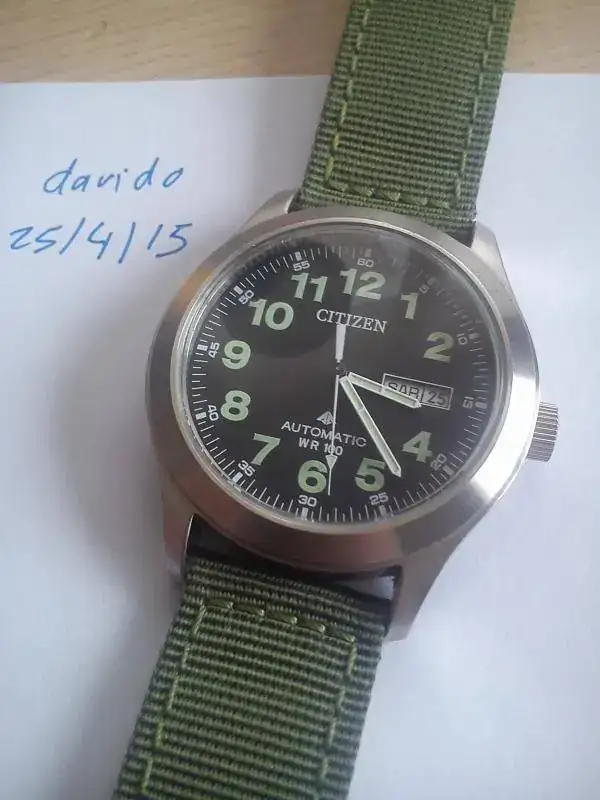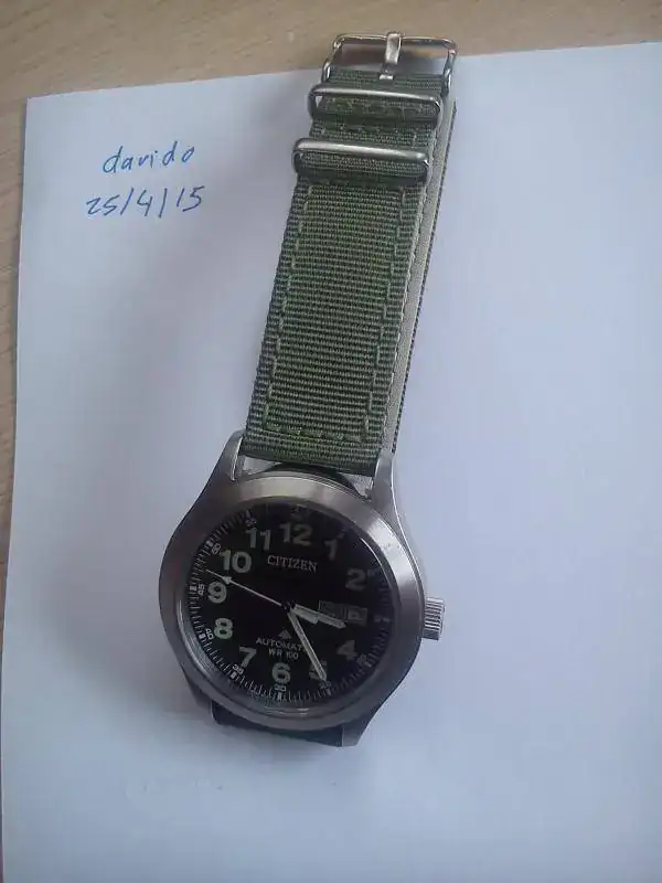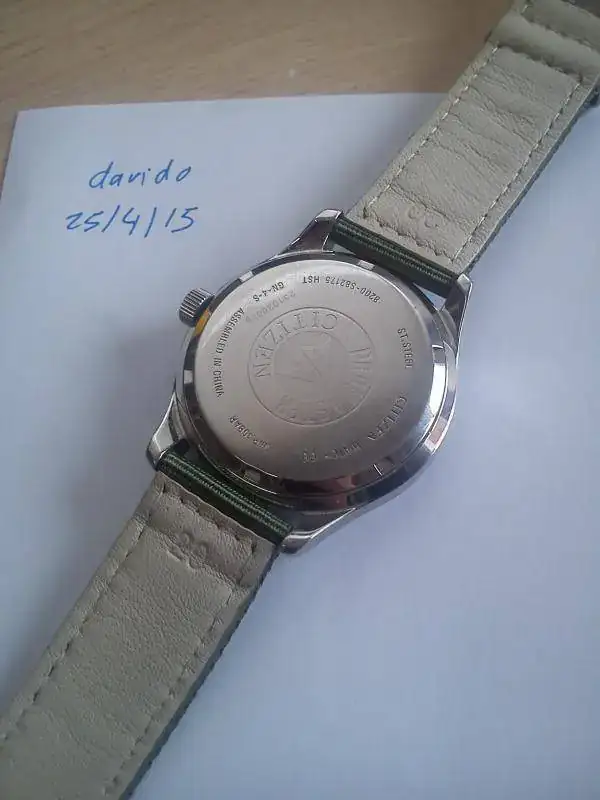A la venta es Citizen con estética marcadamente militar. El estado general es muy bueno. Ha tenido uso, pero no presenta ninguna marca especialmente reseñable. He sustituido recientemente su mecanismo original Miyota 8200 por otro 8205 (por tantola estanqueidad no está asegurada).