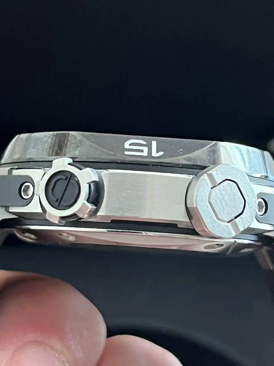 Caja (medidas):44mm-48’8 con coronas. Bisel con corona de bloqueo/ antibloqueo y asas móviles.