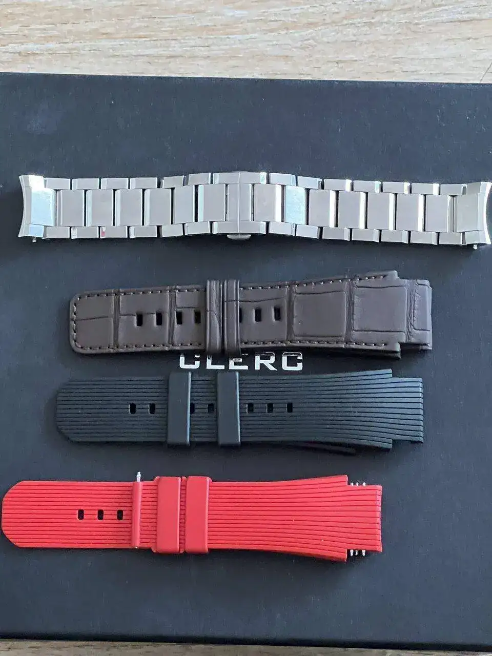 Brazalete: 4 correas. 1 negra de cocodrilo y caucho, 1 de cocodrilo mate marrón chocolate, 1 caucho rojo, 1 de caucho negro, armís de acero con todos sus eslabones