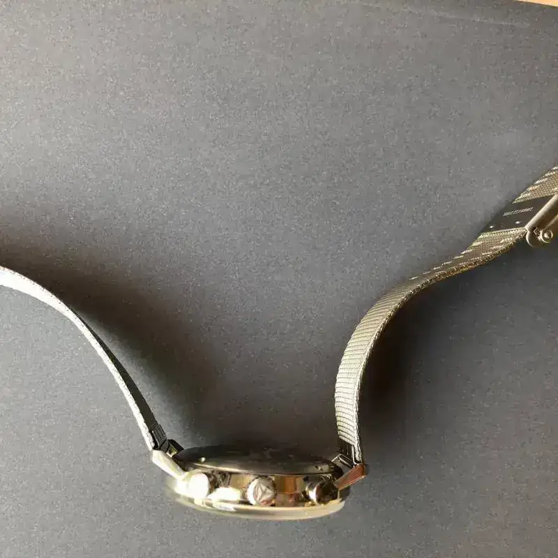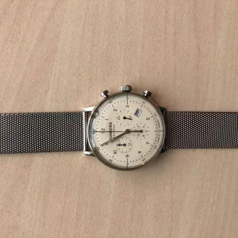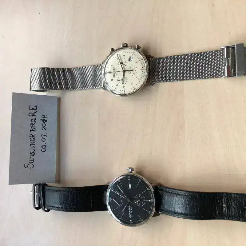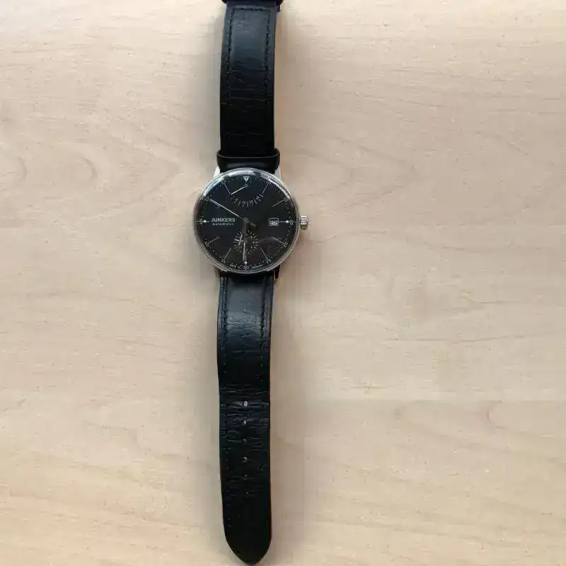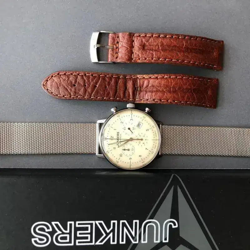 El segundo es un Junkers Bauhaus 6086-5 con Crono, está con muy poco uso. El reloj lleva puesta una correa milanesa y una original marrón al que le falta el pasador y que, de cualquier forma no es de muy buena calidad.