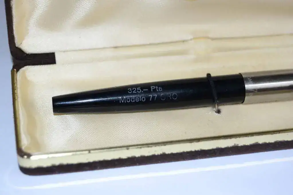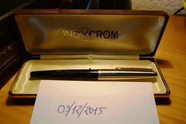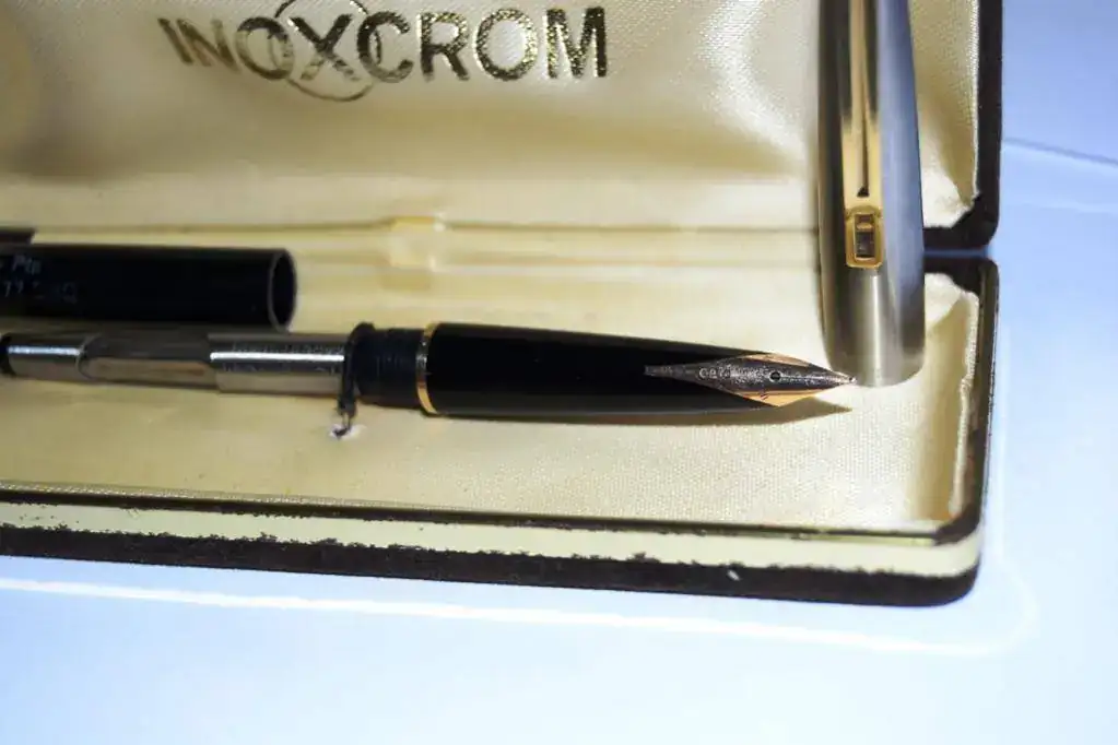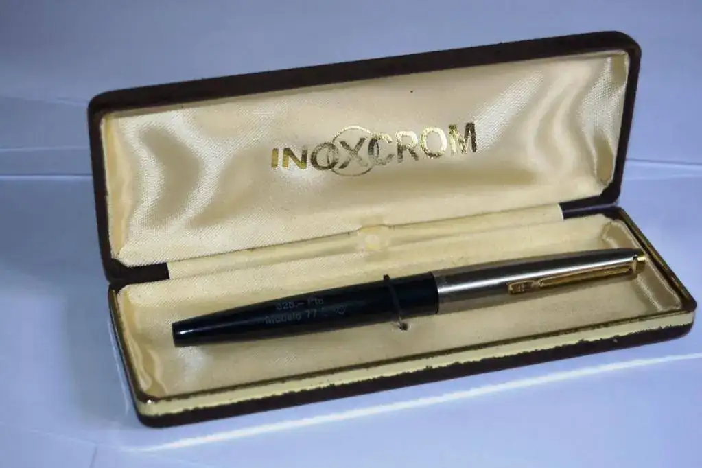 Pongo en venta esta Inoxcrom 77/O con el plumín largo o tipo "sheaffer" y con convertidor aerométrico también Inoxcrom. La pluma está usada por mí un par de veces pero antes de eso no creo que se hubiera usado, porque, como se ve en las fotos, tiene las marcas de tiza cuasi perfectas, así que la pongo a la venta por 45€ con la caja de terciopelo que se ve en las fotos que es marrón oscuro.