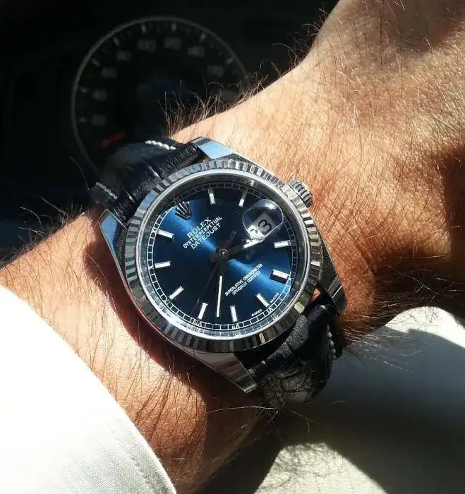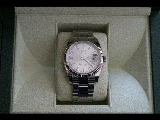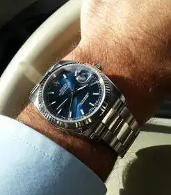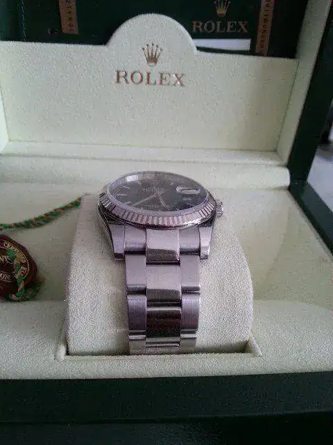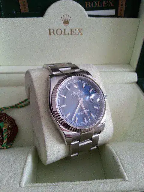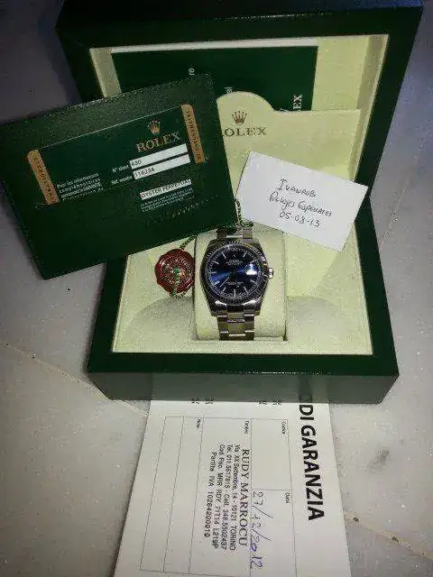 Como dice el titulo vendo mi Rolex Datejust por no usarlo y haber entrado en la familia otro similar (mi padre). Se trata del ultimo modelo en catalogo, cuyo precio ronda los 6.500e. Es un rolesor de bisel acanalado de oro blanco con esfera azul, indices de trazos y armis oyster. Adquirido por mi en joyeria en diciembre de 2012 con un año de garantia (aunque tenia los plasticos puestos, no era nuevo). Dicha garantia caduca el proximo diciembre por lo que aun está cubierto. Las caracteristicas del reloj son de sobra conocidas, con la caja nueva de "hombros anchos", 36mm, anillo de seguridad , 100m de resistencia al agua, cristal de zafiro..la esfera cambia de color azul brillo a mate segun le de la luz. Intenté captar dichos matices en las fotos. Espectacular. Es estado del reloj es fantastico, pero si quereis mas fotos me mandais un numero de whats up y envio todas las fotos que hagan falta.