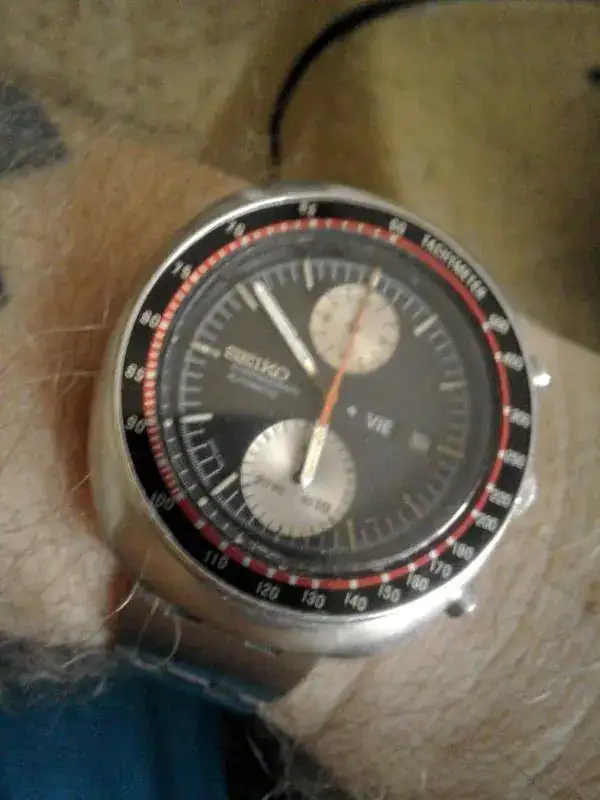 En esta ocasión propongo para su cambio o venta este SEIKO UFO 6138 0011 DEL AÑO 1.974. El reloj es todo original salvo el insert del bisel que es aftermarket. Cristal original (nunca lo he pulido), esfera original, agujas originales y brazalete SEIKO ( max. 18 cm). El reloj funciona correctamente, carga automático y admite carga manual, el crono resetea a cero bien. Las fotos a contraluz exageran las marcas del cristal, vamos, que el reloj en la muñeca se ve como lo que es, un reloj vintage original para usar desde el primer día. Estudiaría cambio por SEIKO NEW TURTLE o SEIKO SUMO. Saludos.