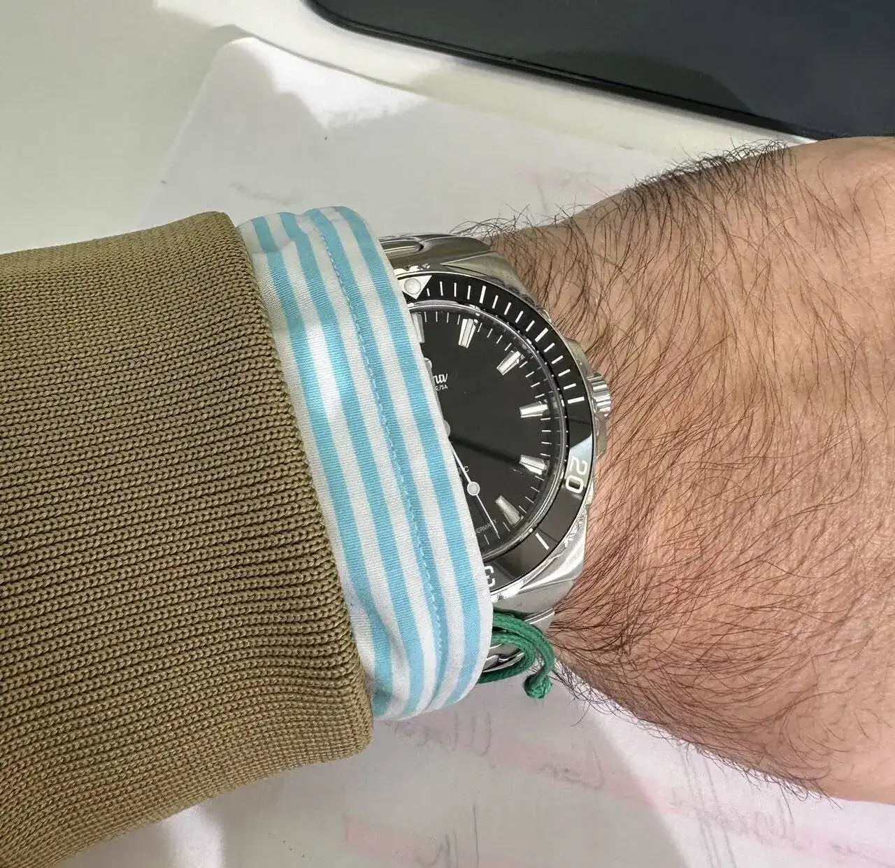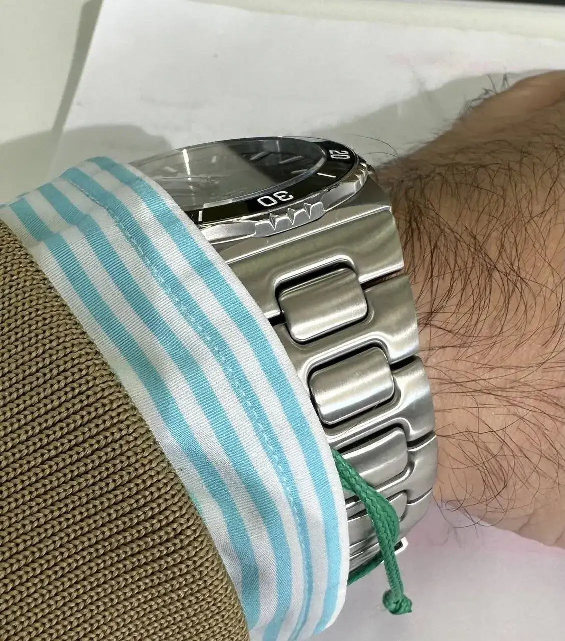 Es un reloj generoso de dimensiones, pero que se asienta en la muñeca a las mil maravillas y cuyo peso está más que compensado. Y la altura del reloj, al ser sin asas, es la misma que el diámetro prácticamente.