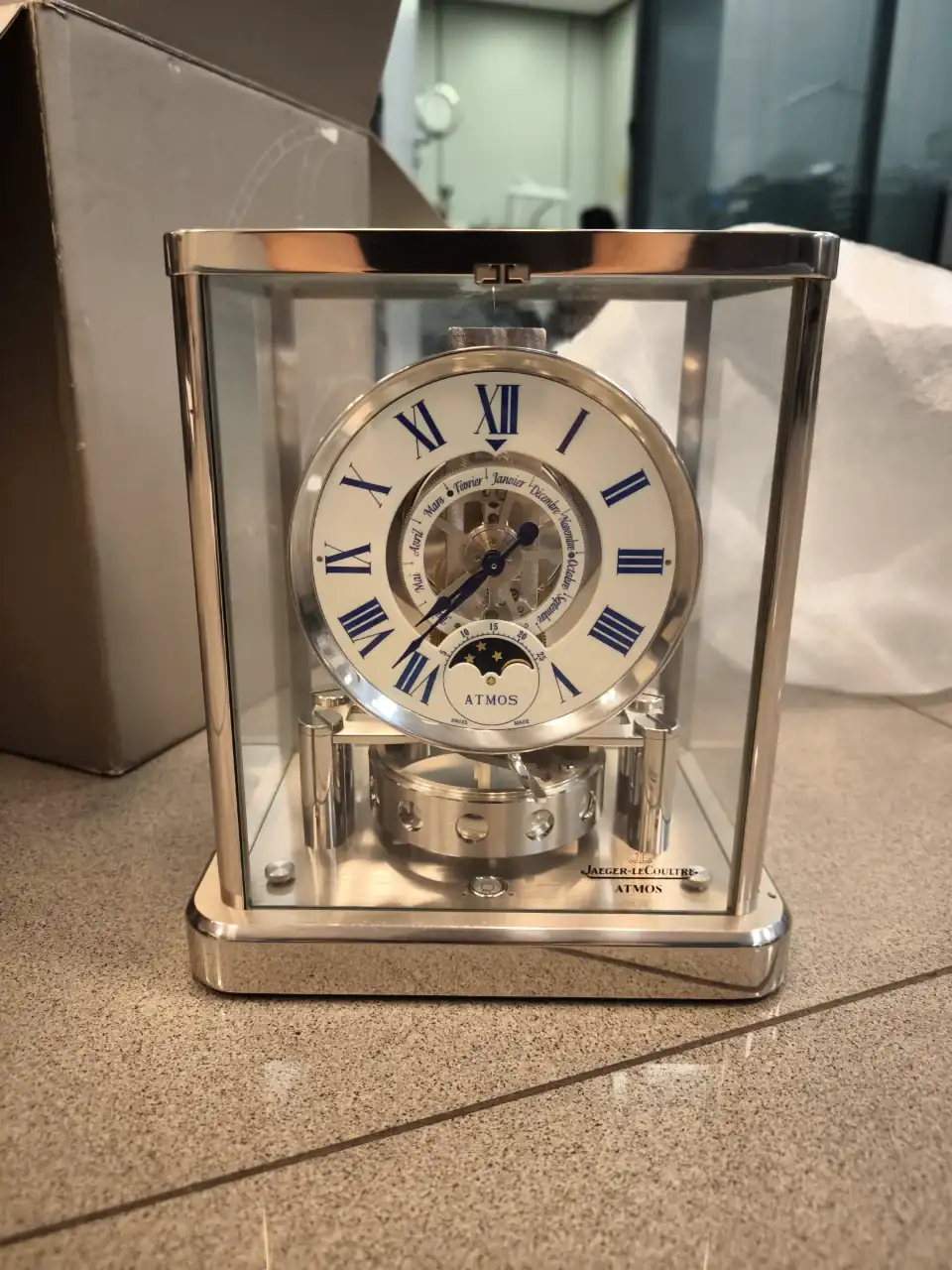 Solamente pone ATMOS, debajo de las XII y debajo del número VI (invertido en la esfera) pone en letras más pequeñas MADE IN FRANCE