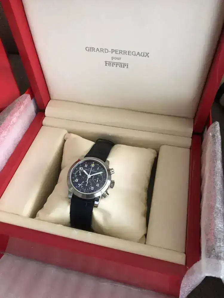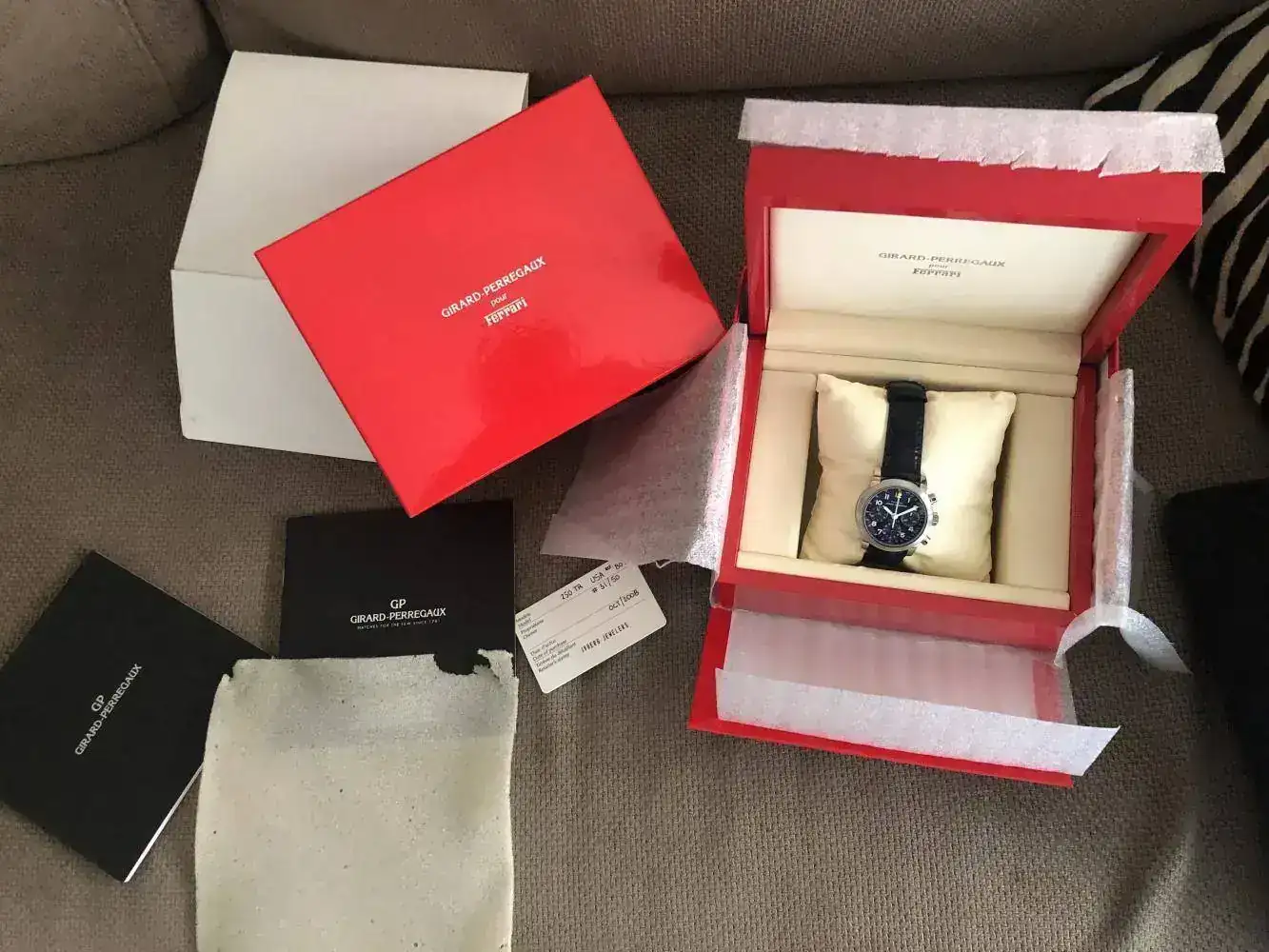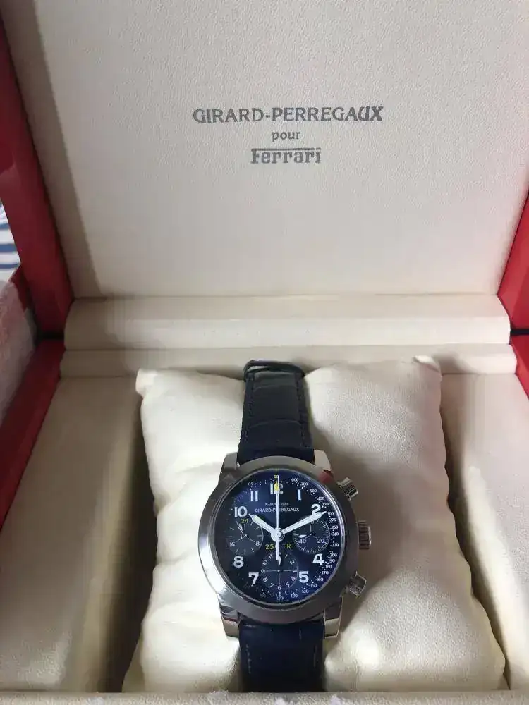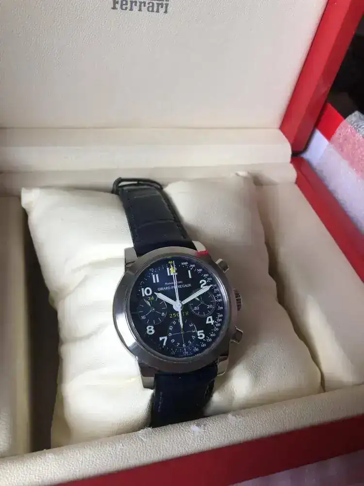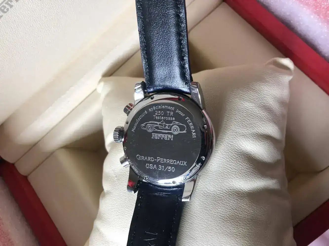 A principios del año 2000, Girard Perregaux y Ferrari firmaron un acuerdo de colaboración que estuvo vigente unos cuantos años, y de ahí la cantidad de relojes de temática “Racing y motor” de GP. En este caso, es conmemorativo de un modelo muy particular, el 250TR Testarrosa, pero……con la particularidad de ser solo para el mercado de USA, tal como viene reflejado en la trasera.