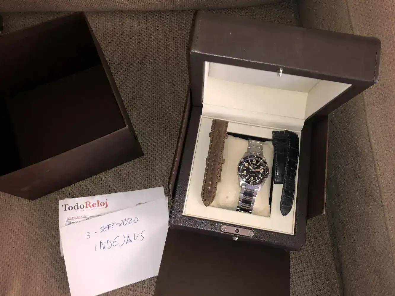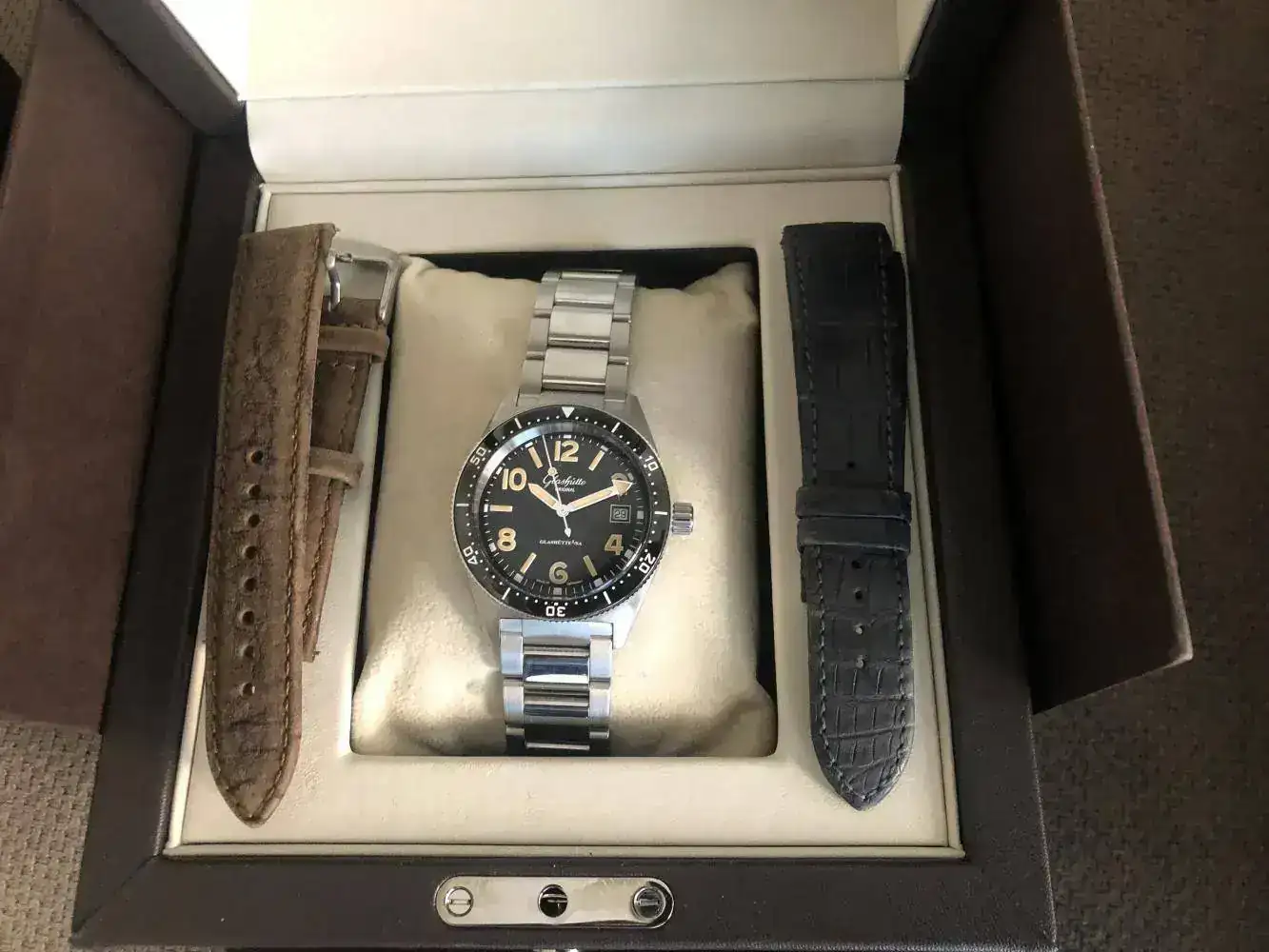 La dotación es la que aparece en las fotos, caja, reloj y dos correas que le sientan de cine compradas para el reloj. una nubuk sin uso , y otra de alligator gris Glashutte, esta sí usada.