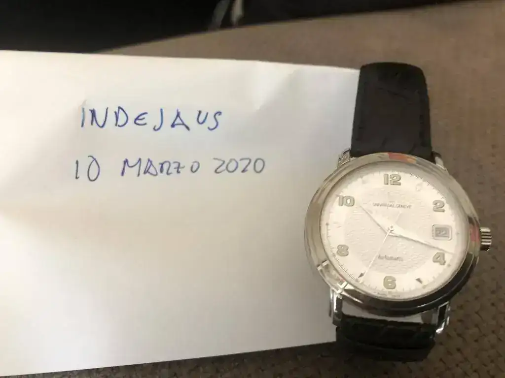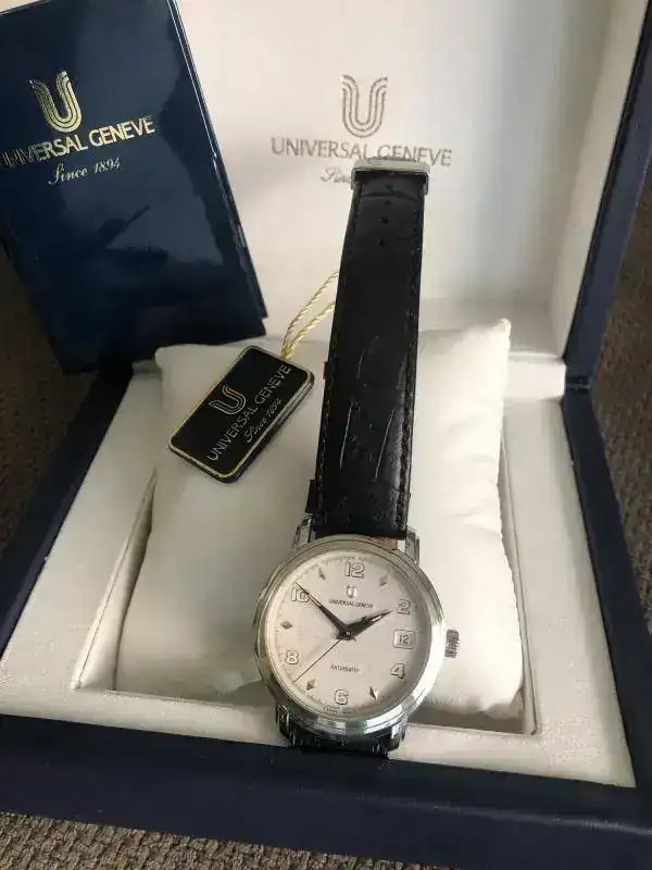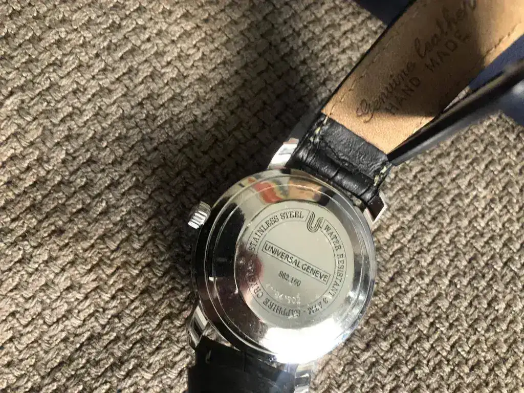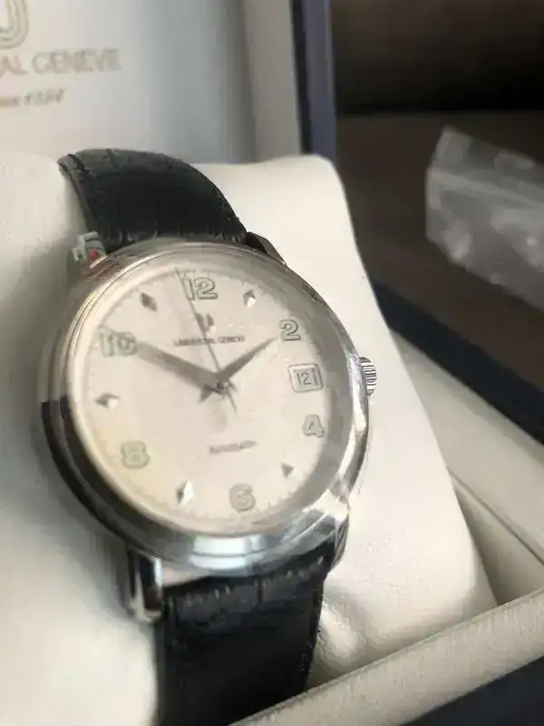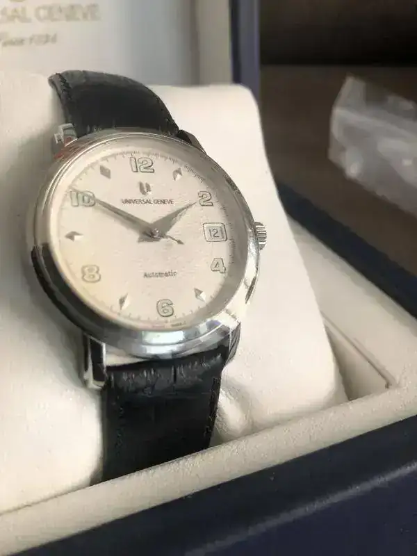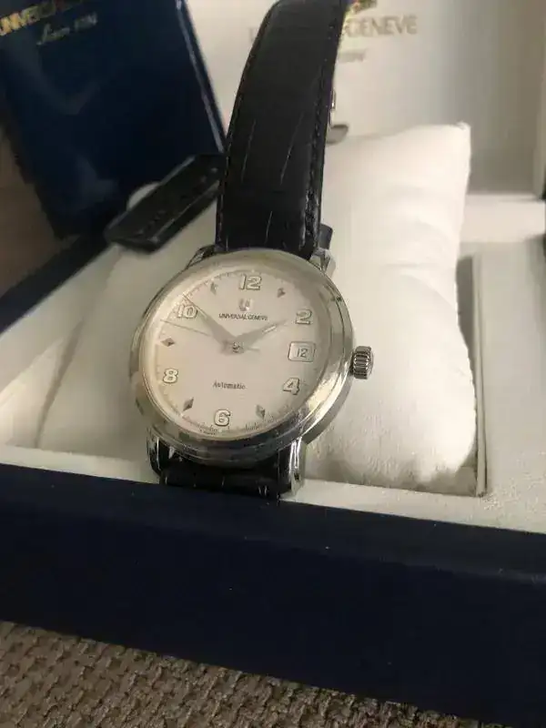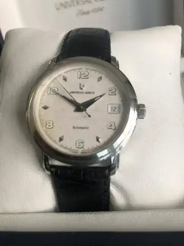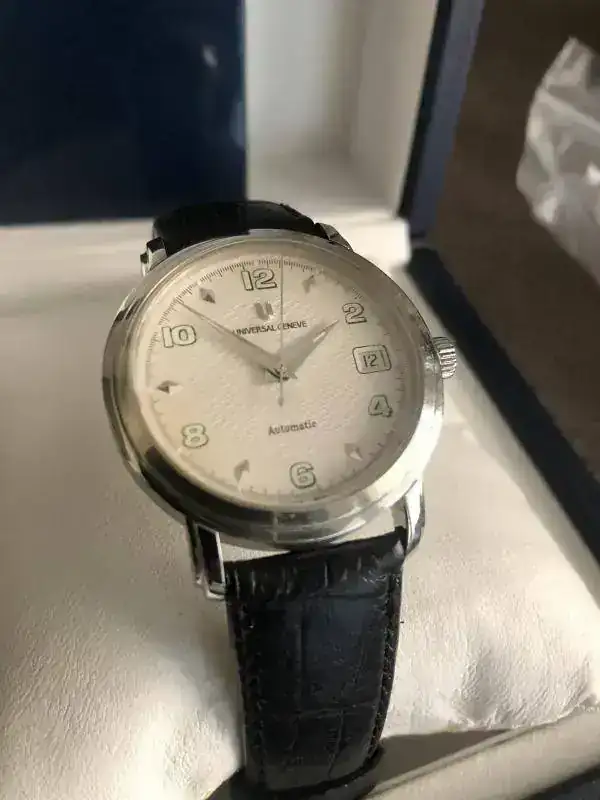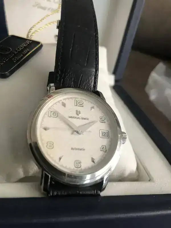 fruto de mis últimos enredos en un multicambio, me he quedado con un par de Universal Geneve en estado NOS como parte de pago. La verdad es que este es precioso, pero me voy a quedar uno de los otros y este lo saco para seguir enredando....lo que viene siendo mi afición por la relojería.