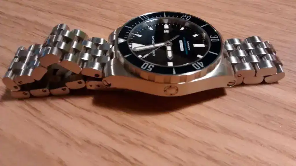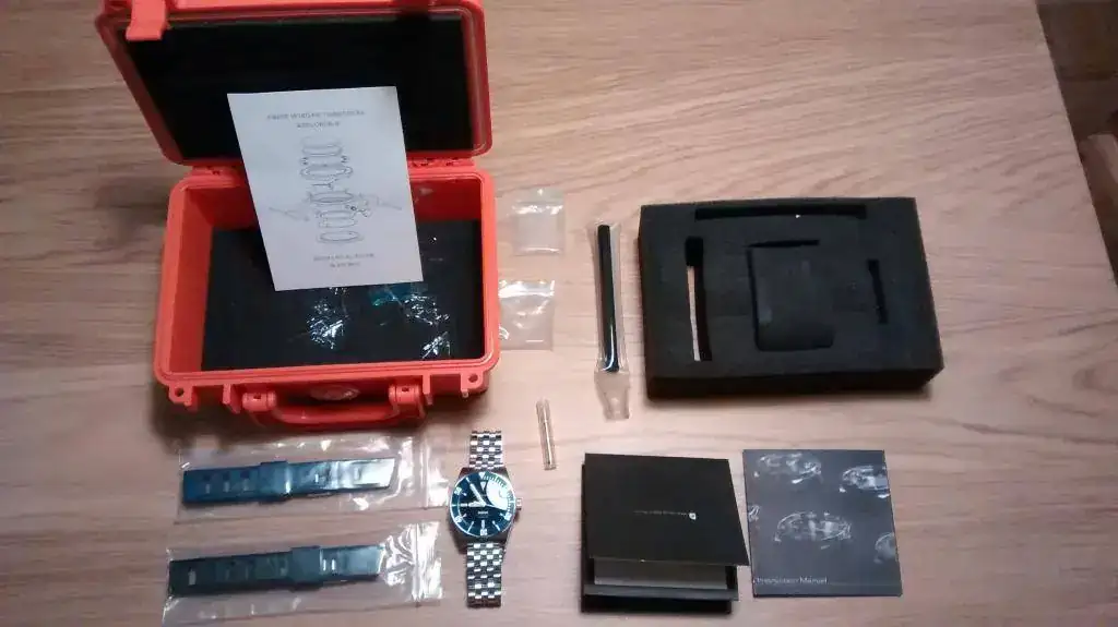 Como veréis en las fotos incluye una dotación completísima: maletín acolchado, instrucciones, garantía, postal del fabricante (a nombre del comprador original), destornillador, pasador extra, dos correas de caucho extra (azul y negra) y dos bolsitas de plástico para guardar los eslabones extra (el reloj lo guardo con todos los eslabones puestos para que encaje bien en el soporte).