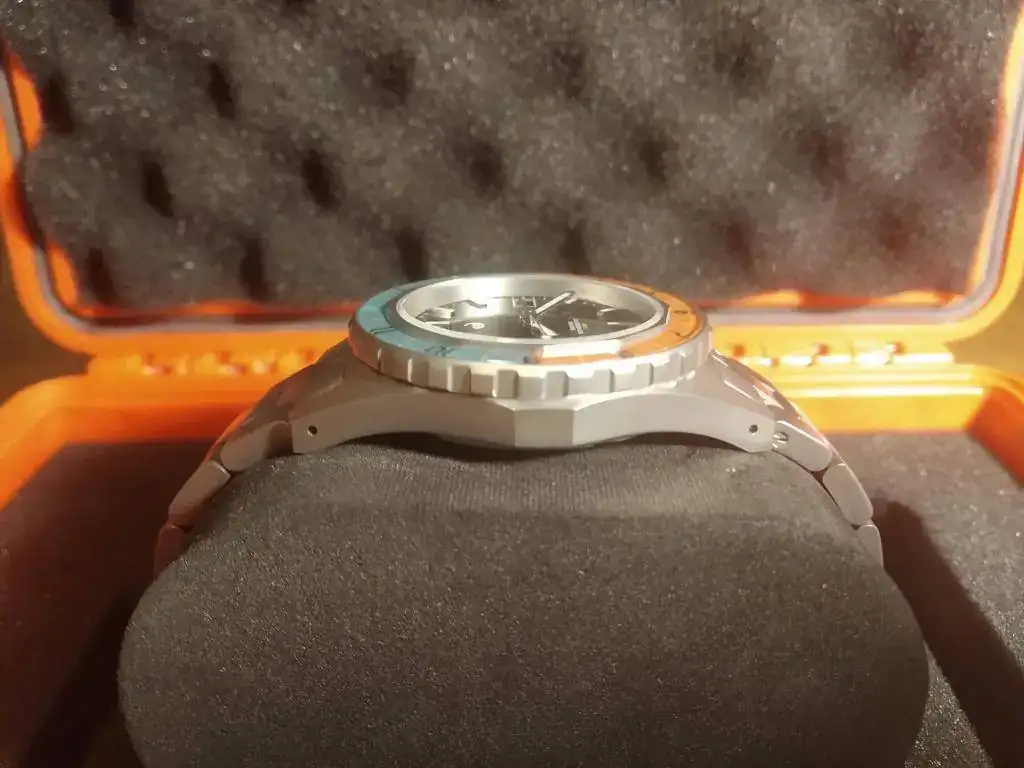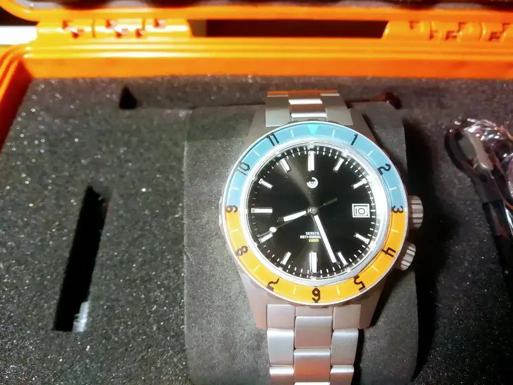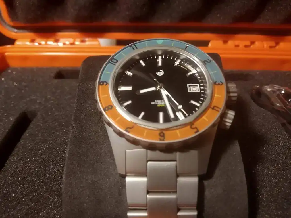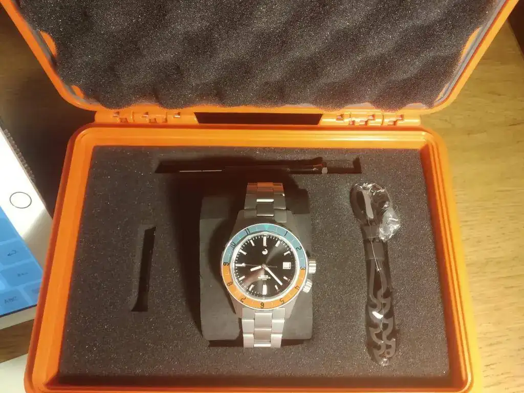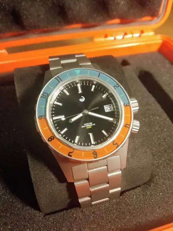 Saco a la venta una buena oportunidad para hacerse con este modelo en estado de reestreno, se trata de un Obris Morgan SeaStar 70s recibido hace tres meses y que me habré puesto en 3 ocasiones contadas, por lo que se encuentra en un estado impoluto, ni siquiera presenta todavía los inevitables pelos en el cierre. Tiene un tamaño apto para todo el mundo de 40,5mm y en su interior late una siempre fiable Miyota 9015. El resto de características más destacables son 200 metros, válvula de helio, antimagnético, cristal zafiro con antireflejos y tambien bisel de zafiro en esos preciosos tonos azul y naranja. El acabado arenado que también tengo en otro Obris Morgan con el mismo acabado hace años (Pradata), os aseguro que ofrece una protección fantástica contra arañazos, ya que el Pradata sí lo he usado mucho y está impoluto.