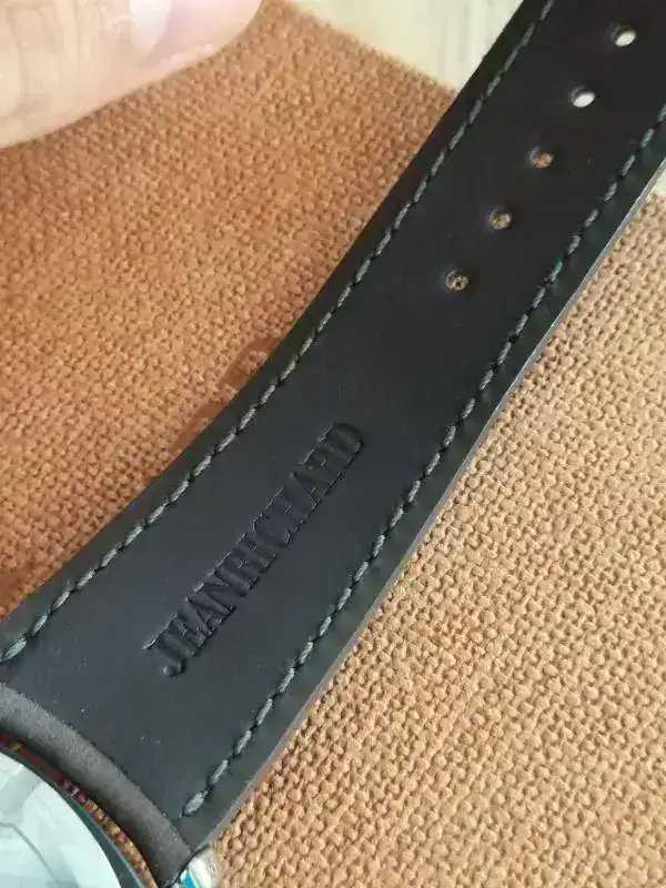 La correa es de una exquisita piel becerro Barenia© de gran calidad que le aporta un toque de elegancia, sin restarle equilibrio a ese espíritu que de por sí tienen los JeanRichard. Se acompaña de un excelente cierre de acero con la marca grabada.