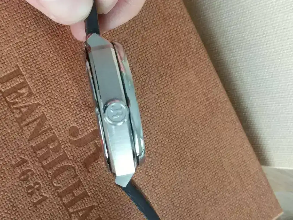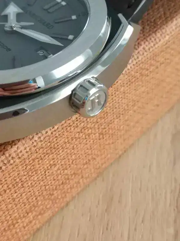 Con una resistencia al agua de 100 metros, se trata de un todo-terreno en toda regla, con su corona sin roscar (signo de la calidad del sistema de estanqueidad) que presenta el logo de la marca en relieve y un agradable tacto, muy fácil de manipular gracias a su estriado.
