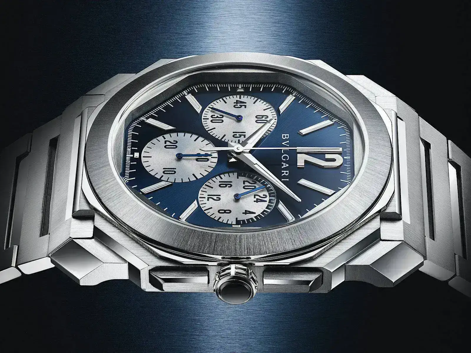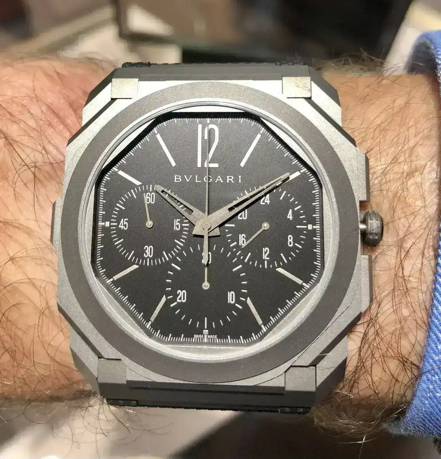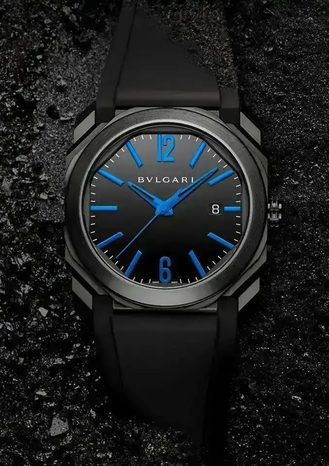 Reloj Octo Finissimo Chrono GMT con movimiento mecánico de manufactura extrafino con cronógrafo y GMT, carga automática con rotor periférico en platino, caja en titanio, fondo transparente, esfera negra y correa en caucho negro.