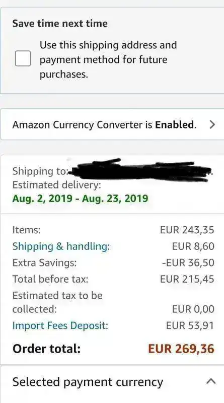 Claro, esos son los impuestos aduaneros. El total a pagar ahora mismo es de 269,36€.