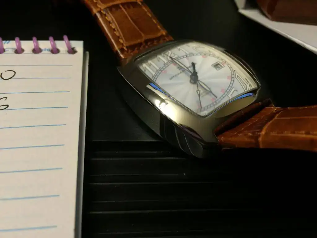 El estado del reloj es muy bueno, con ligeras marcas del uso que seguramente salieran con el famoso capecod. Casi no tiene pelillos, lo más reseñable es un "triple pelo" debajo del 5 que en foto no me ha salido bien pero que en vivo al ser acabado espejo casi ni se aprecia.