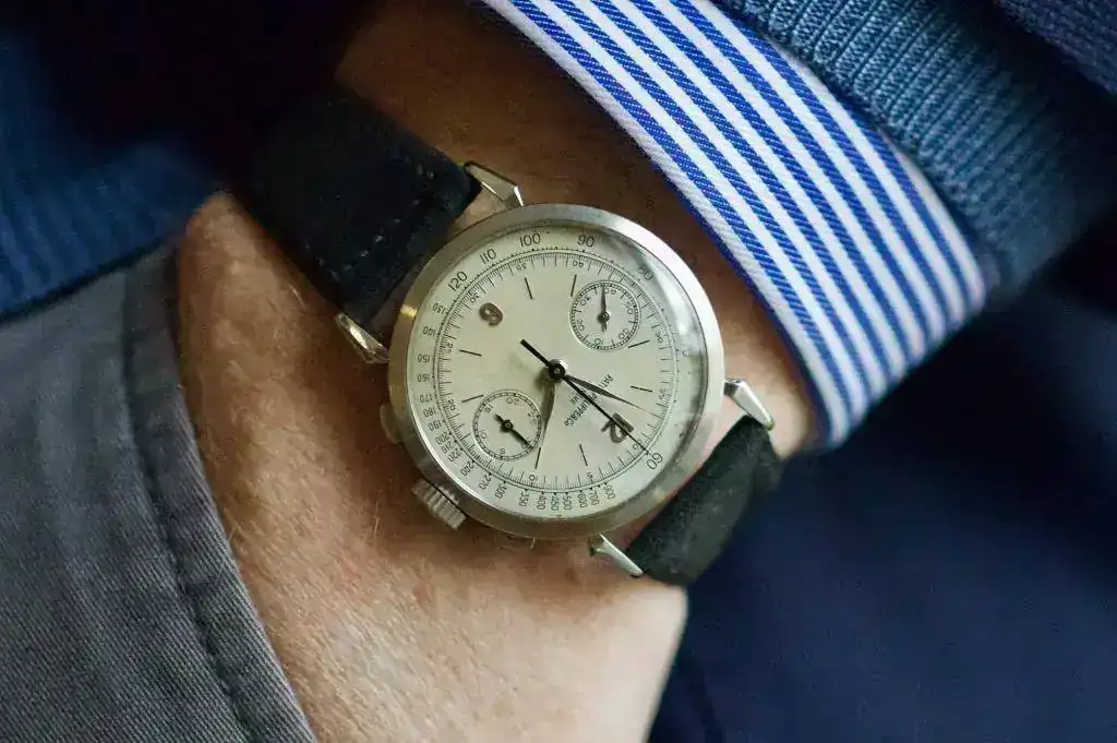 La referencia. 1579 es un favorito entre los coleccionistas de Patek por varias razones. Uno es el tamaño, con 36 mm, este es uno de los cronógrafos vintage más grandes de Patek, y otro es el diseño de sus asas; Las asas de "araña" le dan al reloj un encanto adicional considerable y, junto con sus dimensiones físicas, hacen que cualquier 1579 sea un giro de cabeza.