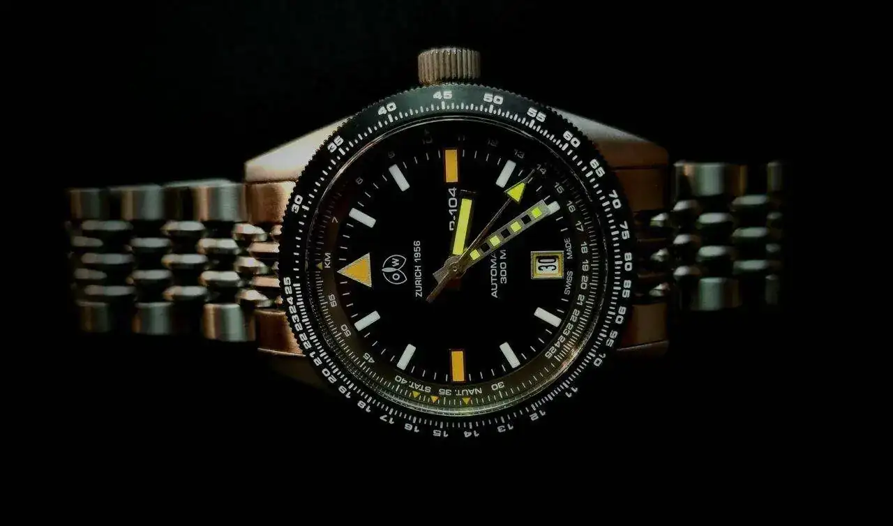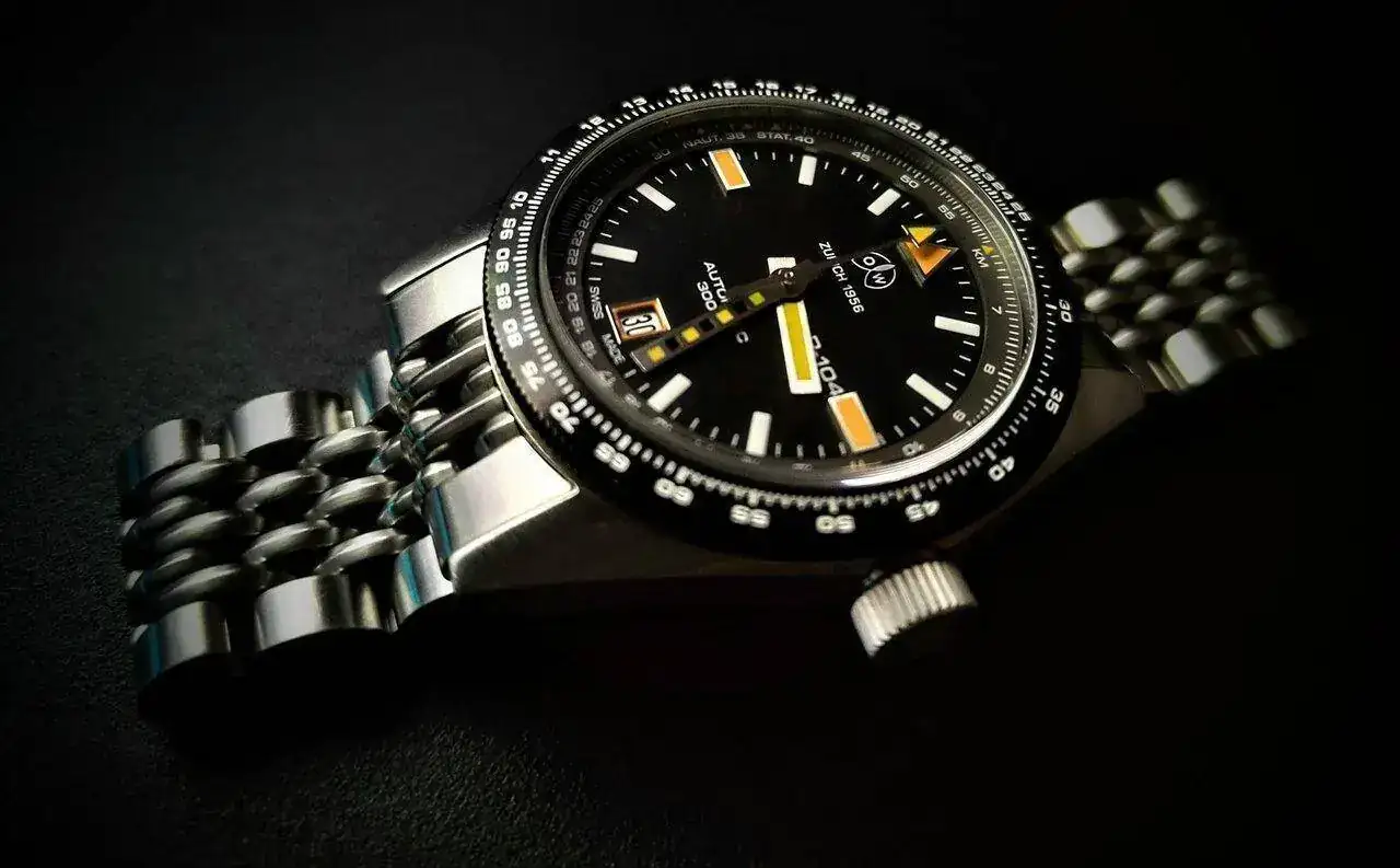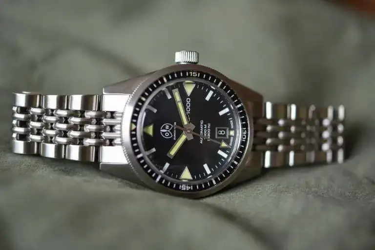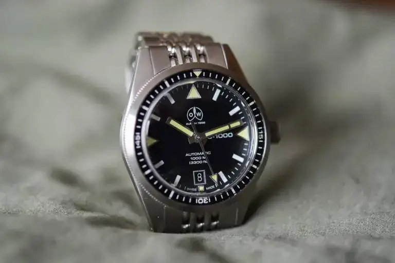 La caja, en acero inoxidable cepillado, mide 39,5 mm x 16,8 mm. Tiene un cristal de zafiro recubierto de AR semicuado y es resistente al agua hasta 500 metros. Tiene una parte trasera atornillada, una corona atornillada y dos empujadores con 4 juntas. Fecha ajustada por el empujador de buceo especial a las 10 en punto. Bisel de brújula giratorio de 360 grados con marcadores de dirección cardinal y una escala de buzo de 20 minutos.