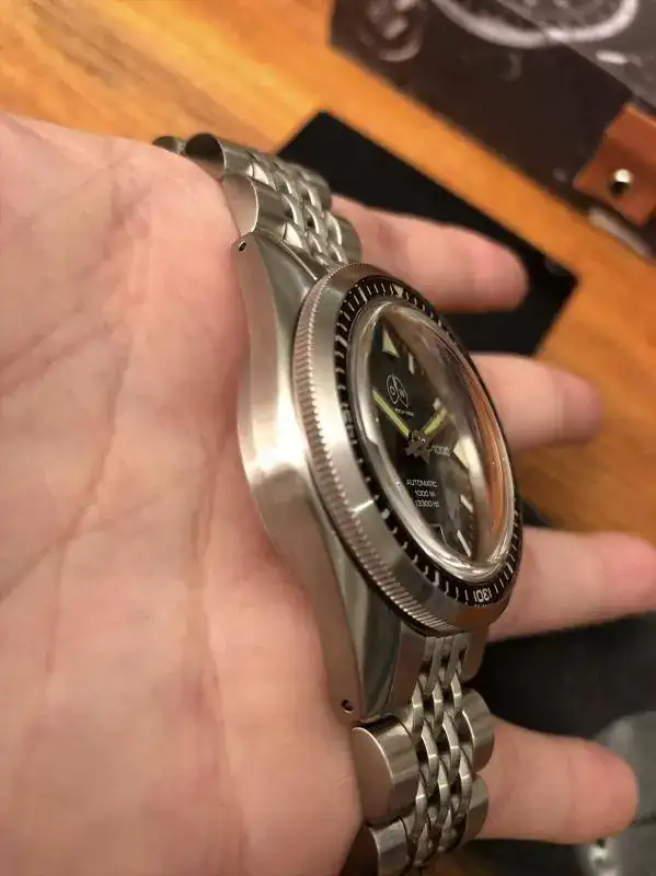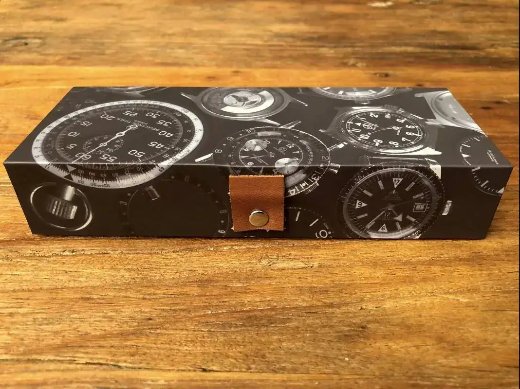 Incluye toda la dotación original del modelo S: brazalete Beads of Rice de acero inoxidable 316L con cierre desplegable y doble cierre de seguridad extra para cuando se bucea, estuche duro para guardar el reloj, y estuche/funda de viaje "de cuero" según dice el traductor de Google (mi sensación es como de una piel muy suave, de color gris, con cierre y muy cómoda para llevarlo cuando se va de viaje, no lo había visto antes en un reloj y me ha producido una grata impresión).