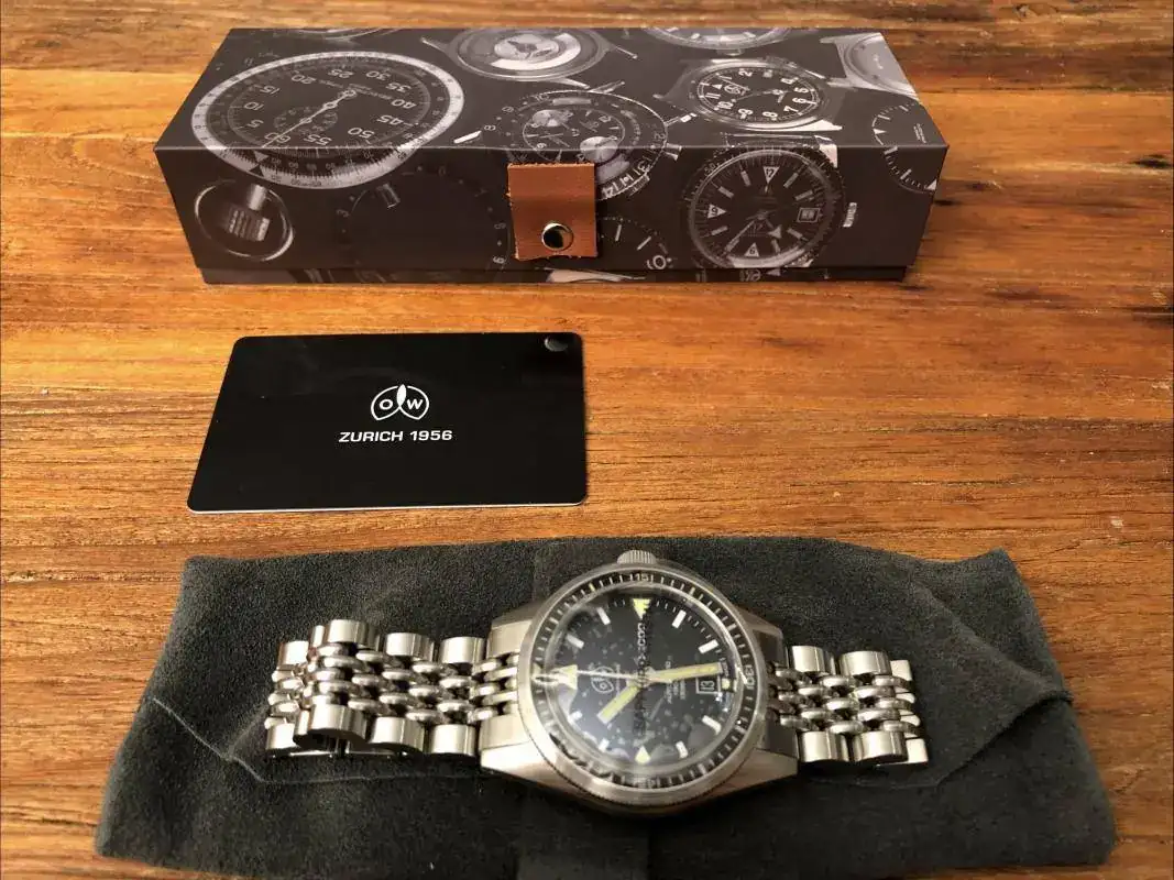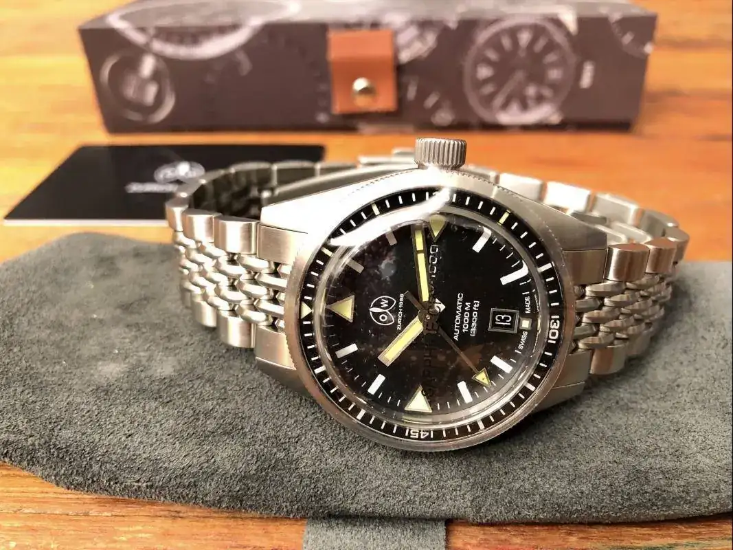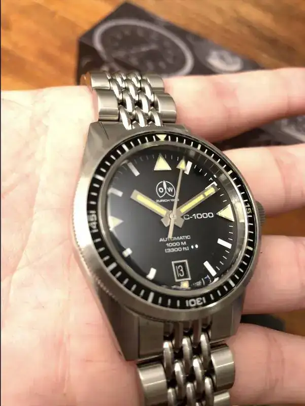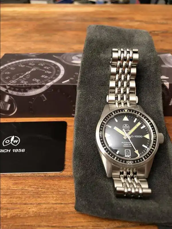 pongo a la venta un Ollech & Wajs C-1000 S, ("S" es la versión más completa ya que va con el Armis), ya sabéis tributo al mítico Caribbean 1000, fui de los primeros en estar en lista de espera ya que era un modelo que llevaba años esperando con mucha ilusión que se reeditara; solo los primeros 56 que se apuntaron en la lista de espera llevan el número de serie grabado en la corona), este en concreto es el nº45 de 56.