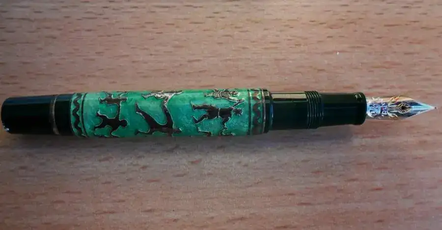 El cañón está esmaltado en verde sobre una capa contra la cual se graba figuras de plata bailando en la celebración de la nueva Sudáfrica y se entrelaza con incrustaciones de hojas de la misma riqueza de esmalte verde. El símbolo de las hojas se repite en la la tapa y en la punta y se utilizó también para la tapa de la caja de presentación de roble .
