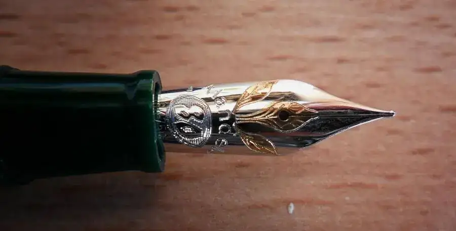 El plumín es de 18k. con mascara platinada donde vemos el dibujo de tres hojas del clip, la palabra Mandela y la cifra 80.